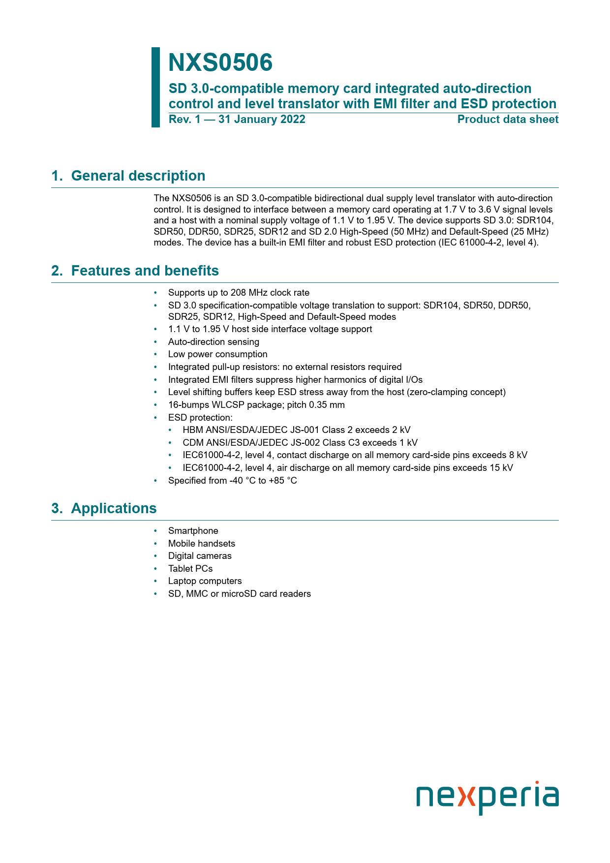 NXS0506 SD 3.0-compatible memory card integrated auto-direction control and level translator with EMI filter and ESD protection Rev. 1 — 31 January 2022 Product data sheet 1. General description