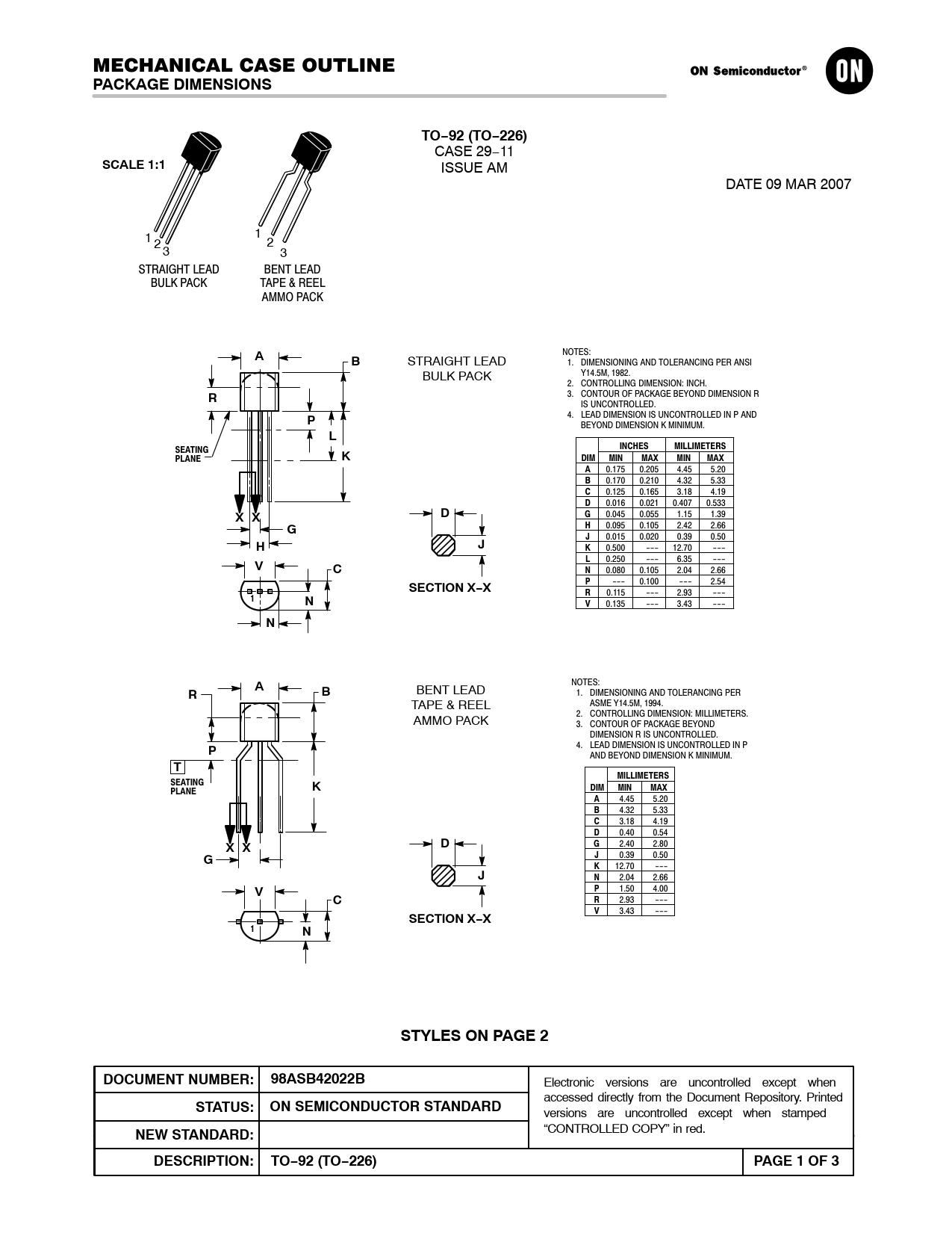 PACKAGE DIMENSIONS. TO−92 (TO−226). SCALE 1:1. SEATING. INCHES. MILLIMETERS. PLANE. DIM. MIN. MAX. X X. SECTION X−X. STYLES ON PAGE 2