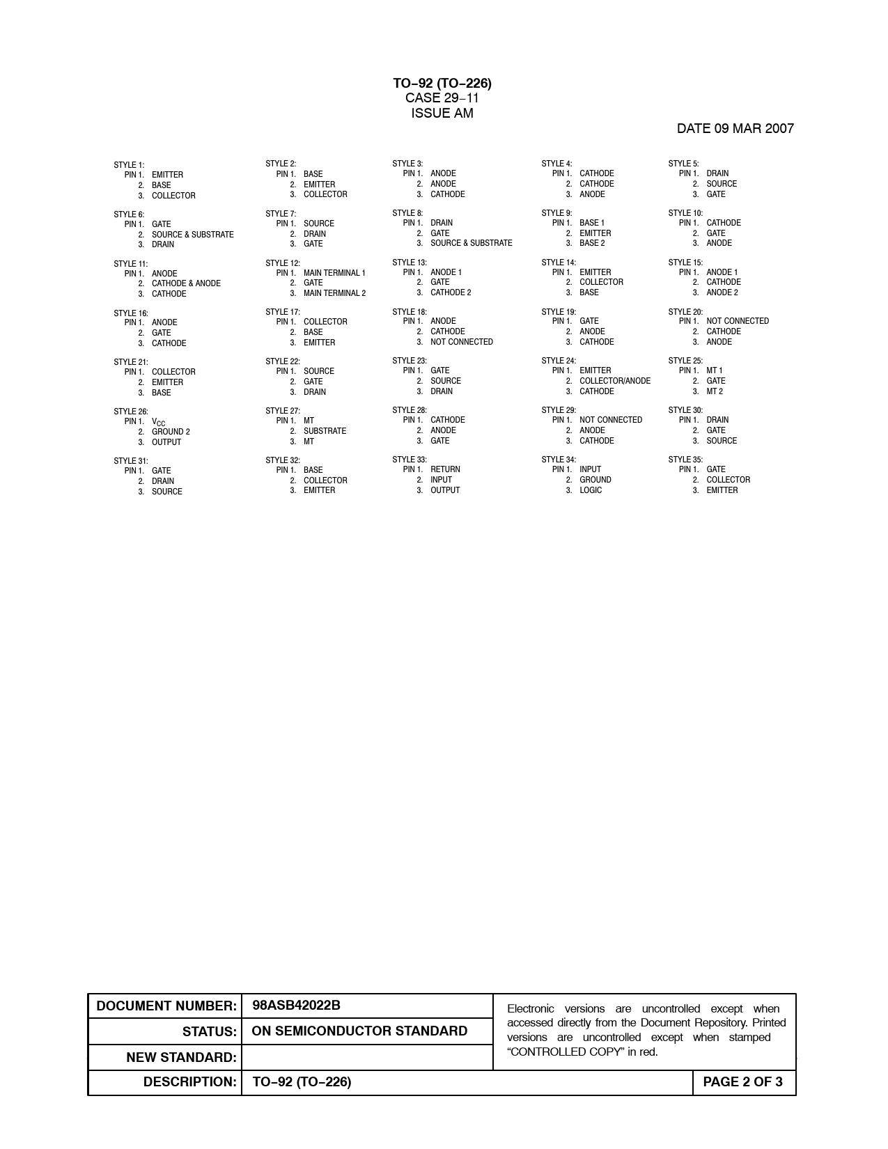 CASE 29−11 ISSUE AM DATE 09 MAR 2007 STYLE 1: STYLE 2: STYLE 3: STYLE 4: STYLE 5: PIN 1. EMITTER PIN 1. BASE PIN 1. ANODE PIN 1. CATHODE PIN 1. DRAIN 2. BASE 2. EMITTER 2. ANODE 2. CATHODE 2. SOURCE 3. COLLECTOR 3. COLLECTOR 3. CATHODE 3. ANODE 3. GATE STYLE 6: STYLE 7: STYLE 8: STYLE 9: STYLE 10: PIN 1. GATE PIN 1. SOURCE PIN 1. DRAIN PIN 1. BASE 1 PIN 1. CATHODE 2. SOURCE & SUBSTRATE 2. DRAIN 2. GATE 2. EMITTER 2. GATE 3. DRAIN 3. GATE 3. SOURCE & SUBSTRATE 3. BASE 2 3. ANODE STYLE 11: STYLE 12: STYLE 13: STYLE 14: STYLE 15: PIN 1. ANODE PIN 1. MAIN TERMINAL 1 PIN 1. ANODE 1 PIN 1. EMITTER PIN 1. ANODE 1 2. CATHODE & ANODE 2. GATE 2. GATE 2. COLLECTOR 2. CATHODE 3. CATHODE 3. MAIN TERMINAL 2 3. CATHODE 2 3. BASE 3. ANODE 2 STYLE 16: STYLE 17: STYLE 18: STYLE 19: STYLE 20: PIN 1. ANODE PIN 1. COLLECTOR PIN 1. ANODE PIN 1. GATE PIN 1. NOT CONNECTED 2. GATE 2. BASE 2. CATHODE 2. ANODE 2. CATHODE 3. CATHODE 3. EMITTER 3. NOT CONNECTED 3. CATHODE 3. ANODE STYLE 21: STYLE 22: STYLE 23: STYLE 24: STYLE 25: PIN 1. COLLECTOR PIN 1. SOURCE PIN 1. GATE PIN 1. EMITTER PIN 1. MT 1 2. EMITTER 2. GATE 2. SOURCE 2. COLLECTOR/ANODE 2. GATE 3. BASE 3. DRAIN 3. DRAIN 3. CATHODE 3. MT 2 STYLE 26: STYLE 27: STYLE 28: STYLE 29: STYLE 30: PIN 1. V PIN 1. CATHODE PIN 1. NOT CONNECTED PIN 1. DRAIN CC PIN 1. MT 2. GROUND 2 2. SUBSTRATE 2. ANODE 2. ANODE 2. GATE 3. OUTPUT 3. MT 3. GATE 3. CATHODE 3. SOURCE STYLE 31: STYLE 32: STYLE 33: STYLE 34: STYLE 35: PIN 1. GATE PIN 1. BASE PIN 1. RETURN PIN 1. INPUT PIN 1. GATE 2. DRAIN 2. COLLECTOR 2. INPUT 2. GROUND 2. COLLECTOR 3. SOURCE 3. EMITTER 3. OUTPUT 3. LOGIC 3. EMITTER