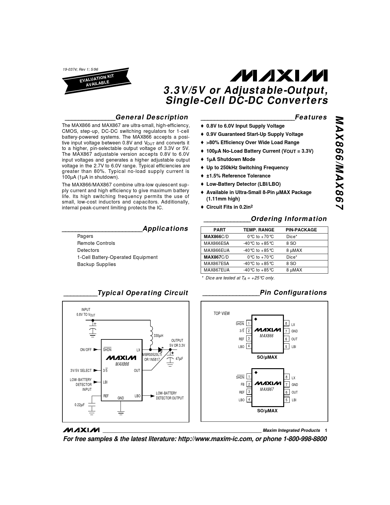 EVALUATION KIT. AVAILABLE. 3.3V/5V or Adjustable-Output,. Single-Cell DC-DC Converters. MAX866/MAX867