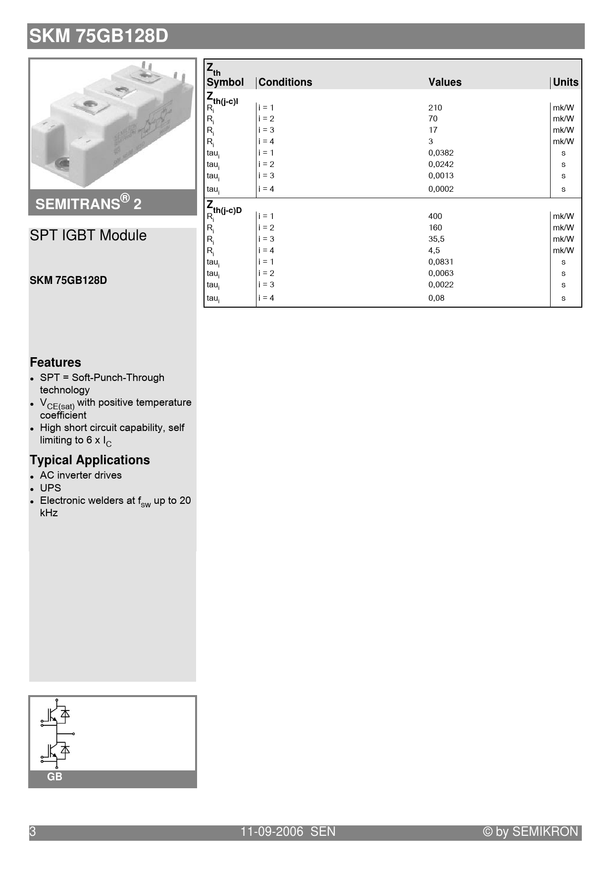 SKM 75GB128D. Zth Symbol. Conditions. Values. Units. Zth(j-c)l. SEMITRANS® 2. Zth(j-c)D. Features. Typical Applications