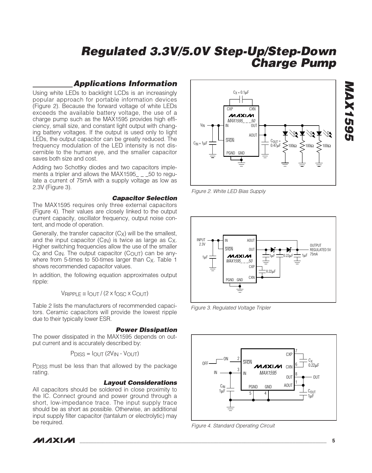 Regulated 3.3V/5.0V Step-Up/Step-DownCharge PumpMAX1595Applications Information Using white LEDs to backlight LCDs is an increasingly CX = 0.1µF popular approach for portable information devices (Figure 2). Because the forward voltage of white LEDs CXP CXN exceeds the available battery voltage, the use of a charge pump such as the MAX1595 provides high effi- MAX1595_ _ _50 ciency, small size, and constant light output with chang- VIN IN OUT ing battery voltages. If the output is used only to light AOUT LEDs, the output capacitor can be greatly reduced. The SHDN COUT = frequency modulation of the LED intensity is not dis- CIN = 1µF 0.47µF 100Ω 100Ω 100Ω cernible to the human eye, and the smaller capacitor PGND GND saves both size and cost. Adding two Schottky diodes and two capacitors imple- ments a tripler and allows the MAX1595_ _ _50 to regu- late a current of 75mA with a supply voltage as low as 2.3V (Figure 3). Figure 2. White LED Bias Supply Capacitor Selection The MAX1595 requires only three external capacitors (Figure 4). Their values are closely linked to the output current capacity, oscillator frequency, output noise con- tent, and mode of operation. Generally, the transfer capacitor (CX) will be the smallest, and the input capacitor (CIN) is twice as large as CX. INPUT IN AOUT Higher switching frequencies allow the use of the smaller 2.3V OUTPUT SHDN OUT REGULATED 5V CX and CIN. The output capacitor (COUT) can be any- 1µF 0.22µF 1µF 75mA 1µF where from 5-times to 50-times larger than CX. Table 1 MAX1595_ _ _50 shows recommended capacitor values. CXP 0.22µF In addition, the following equation approximates output CXN ripple: PGND GND VRIPPLE ≅ IOUT / (2 x fOSC x COUT) Table 2 lists the manufacturers of recommended capaci- Figure 3. Regulated Voltage Tripler tors. Ceramic capacitors will provide the lowest ripple due to their typically lower ESR. Power Dissipation The power dissipated in the MAX1595 depends on out- put current and is accurately described by: P 7 DISS = IOUT (2VIN - VOUT) CXP ON 2 CX SHDN P OFF 6 DISS must be less than that allowed by the package 0.22µF CXN 3 rating. IN IN MAX1595 8 OUT OUT Layout Considerations 1 CIN AOUT All capacitors should be soldered in close proximity to PGND GND 1µF COUT 5 4 the IC. Connect ground and power ground through a 1µF short, low-impedance trace. The input supply trace should be as short as possible. Otherwise, an additional input supply filter capacitor (tantalum or electrolytic) may be required. Figure 4. Standard Operating Circuit _______________________________________________________________________________________5