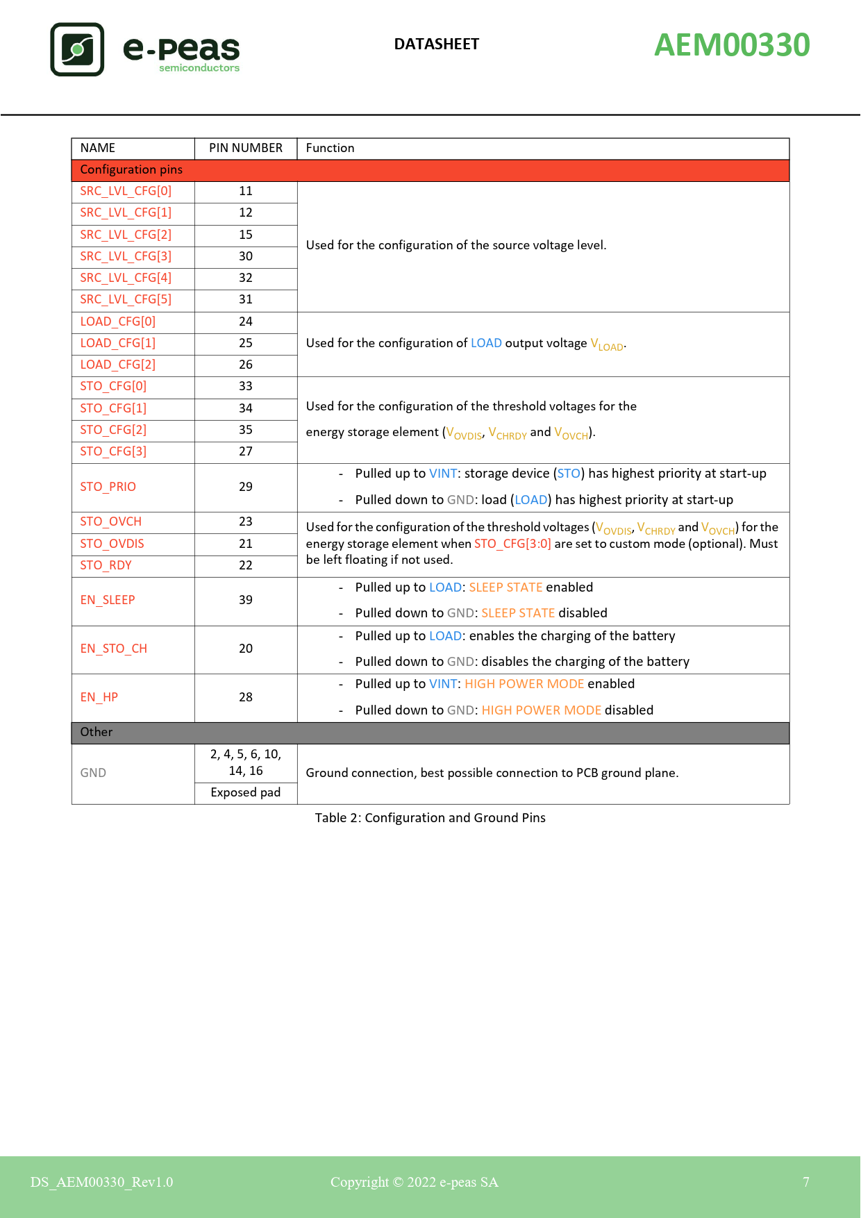 NAME PIN NUMBER Function Configuration pins SRC_LVL_CFG[0] 11 SRC_LVL_CFG[1] 12 SRC_LVL_CFG[2] 15 Used for the configuration of the source voltage level. SRC_LVL_CFG[3] 30 SRC_LVL_CFG[4] 32 SRC_LVL_CFG[5] 31 LOAD_CFG[0] 24 LOAD_CFG[1] 25 Used for the configuration of LOAD output voltage VLOAD. LOAD_CFG[2] 26 STO_CFG[0] 33 STO_CFG[1] 34 Used for the configuration of the threshold voltages for the STO_CFG[2] 35 energy storage element (VOVDIS, VCHRDY and VOVCH). STO_CFG[3] 27 - Pul ed up to VINT: storage device (STO) has highest priority at start-up STO_PRIO 29 - Pul ed down to GND: load (LOAD) has highest priority at start-up STO_OVCH 23 Used for the configuration of the threshold voltages (VOVDIS, VCHRDY and VOVCH) for the STO_OVDIS 21 energy storage element when STO_CFG[3:0] are set to custom mode (optional). Must be left floating if not used. STO_RDY 22 - Pul ed up to LOAD: SLEEP STATE enabled EN_SLEEP 39 - Pul ed down to GND: SLEEP STATE disabled - Pul ed up to LOAD: enables the charging of the battery EN_STO_CH 20 - Pul ed down to GND: disables the charging of the battery - Pul ed up to VINT: HIGH POWER MODE enabled EN_HP 28 - Pul ed down to GND: HIGH POWER MODE disabled Other 2, 4, 5, 6, 10, GND 14, 16 Ground connection, best possible connection to PCB ground plane. Exposed pad Table 2: Configuration and Ground Pins DS D _A _ E A M0 M 033 3 0_Rev e 1.0. 0 0 Copyr y ight h © 2022 2 e-pe p as a SA S Confidential 7 Document Outline Table of Contents List of Tables 1. Introduction 2. Absolute Maximum Ratings 3. Thermal Resistance 4. Typical Electrical Characteristics at 25 °C 5. Recommended Operation Conditions 6. Functional Block Diagram 7. Theory of Operation 7.1. DCDC Converter 7.2. Reset, Wake Up and Start States 7.2.1. Storage Element Priority Supercapacitor as a Storage Element Battery as a Storage Element 7.2.2. Load Priority 7.3. Supply State 7.4. Shutdown State 7.5. Sleep State 7.6. Source Voltage Regulation 7.7. Balancing for Dual-Cell Supercapacitor 8. System Configuration 8.1. High Power / Low Power Mode 8.2. Storage Element Configuration 8.3. Load Configuration 8.4. Custom Mode Configuration 8.5. Disable Storage Element Charging 8.6. Source Level Configuration 8.7. External Components 8.7.1. Storage element information 8.7.2. External inductor information 8.7.3. External capacitors information CSRC CINT CLOAD 9. Typical Application Circuits 9.1. Example Circuit 1 9.2. Example Circuit 2 9.3. Circuit Behaviour 9.4. DCDC Conversion Efficiency From SRC to STO in Low Power Mode 9.4. DCDC Conversion Efficiency From SRC to STO in Low Power Mode 9.5. DCDC Conversion Efficiency From SRC to STO in High Power Mode 9.6. DCDC Conversion Efficiency From STO to LOAD in Low Power Mode 9.7. DCDC Conversion Efficiency From STO to LOAD in High Power Mode 10. Schematic 11. Layout 12. Package Information 12.1. Plastic Quad Flatpack No-Lead (QFN 40-pin 5x5mm) 12.2. Board Layout 13. Revision History