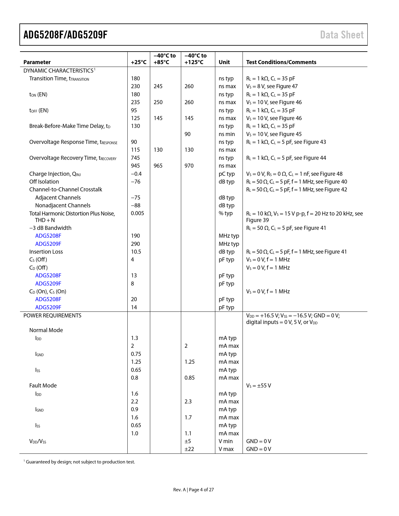 link to page 22 link to page 22 link to page 22 link to page 21 link to page 21 link to page 21 link to page 22 link to page 20 link to page 20 link to page 20 link to page 20 link to page 20 link to page 5 ADG5208F/ADG5209FData Sheet−40°C to−40°C toParameter+25°C +85°C+125°CUnitTest Conditions/Comments DYNAMIC CHARACTERISTICS1 Transition Time, tTRANSITION 180 ns typ RL = 1 kΩ, CL = 35 pF 230 245 260 ns max VS = 8 V, see Figure 47 tON (EN) 180 ns typ RL = 1 kΩ, CL = 35 pF 235 250 260 ns max VS = 10 V, see Figure 46 tOFF (EN) 95 ns typ RL = 1 kΩ, CL = 35 pF 125 145 145 ns max VS = 10 V, see Figure 46 Break-Before-Make Time Delay, tD 130 ns typ RL = 1 kΩ, CL = 35 pF 90 ns min VS = 10 V, see Figure 45 Overvoltage Response Time, tRESPONSE 90 ns typ RL = 1 kΩ, CL = 5 pF, see Figure 43 115 130 130 ns max Overvoltage Recovery Time, tRECOVERY 745 ns typ RL = 1 kΩ, CL = 5 pF, see Figure 44 945 965 970 ns max Charge Injection, QINJ −0.4 pC typ VS = 0 V, RS = 0 Ω, CL = 1 nF, see Figure 48 Off Isolation −76 dB typ RL = 50 Ω, CL = 5 pF, f = 1 MHz, see Figure 40 Channel-to-Channel Crosstalk RL = 50 Ω, CL = 5 pF, f = 1 MHz, see Figure 42 Adjacent Channels −75 dB typ Nonadjacent Channels −88 dB typ Total Harmonic Distortion Plus Noise, 0.005 % typ RL = 10 kΩ, VS = 15 V p-p, f = 20 Hz to 20 kHz, see THD + N Figure 39 −3 dB Bandwidth RL = 50 Ω, CL = 5 pF, see Figure 41 ADG5208F 190 MHz typ ADG5209F 290 MHz typ Insertion Loss 10.5 dB typ RL = 50 Ω, CL = 5 pF, f = 1 MHz, see Figure 41 CS (Off) 4 pF typ VS = 0 V, f = 1 MHz CD (Off) VS = 0 V, f = 1 MHz ADG5208F 13 pF typ ADG5209F 8 pF typ CD (On), CS (On) VS = 0 V, f = 1 MHz ADG5208F 20 pF typ ADG5209F 14 pF typ POWER REQUIREMENTS VDD = +16.5 V; VSS = −16.5 V; GND = 0 V; digital inputs = 0 V, 5 V, or VDD Normal Mode IDD 1.3 mA typ 2 2 mA max IGND 0.75 mA typ 1.25 1.25 mA max ISS 0.65 mA typ 0.8 0.85 mA max Fault Mode VS = ±55 V IDD 1.6 mA typ 2.2 2.3 mA max IGND 0.9 mA typ 1.6 1.7 mA max ISS 0.65 mA typ 1.0 1.1 mA max VDD/VSS ±5 V min GND = 0 V ±22 V max GND = 0 V 1 Guaranteed by design; not subject to production test. Rev. A | Page 4 of 27 Document Outline FEATURES APPLICATIONS FUNCTIONAL BLOCK DIAGRAMS GENERAL DESCRIPTION PRODUCT HIGHLIGHTS TABLE OF CONTENTS REVISION HISTORY SPECIFICATIONS ±15 V DUAL SUPPLY ±20 V DUAL SUPPLY 12 V SINGLE SUPPLY 36 V SINGLE SUPPLY CONTINUOUS CURRENT PER CHANNEL, Sx, D, OR Dx ABSOLUTE MAXIMUM RATINGS ESD CAUTION PIN CONFIGURATIONS AND FUNCTION DESCRIPTIONS TYPICAL PERFORMANCE CHARACTERISTICS TEST CIRCUITS TERMINOLOGY THEORY OF OPERATION SWITCH ARCHITECTURE Overvoltage Reaction ESD Performance Trench Isolation FAULT PROTECTION Power-On Protection Power-Off Protection Digital Input Protection APPLICATIONS INFORMATION POWER SUPPLY RAILS POWER SUPPLY SEQUENCING PROTECTION SIGNAL RANGE POWER SUPPLY RECOMMENDATIONS HIGH VOLTAGE SURGE SUPPRESSION LARGE VOLTAGE, HIGH FREQUENCY SIGNALS OUTLINE DIMENSIONS ORDERING GUIDE