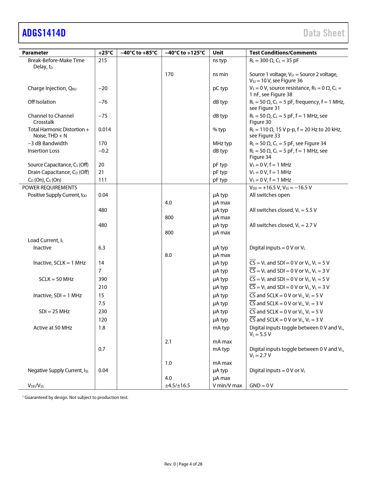 Pages / Page28 / 4 — ADGS1414D. Data Sheet. Parameter. +25°C −40°C to +85°C. −40°C to +125°C. …