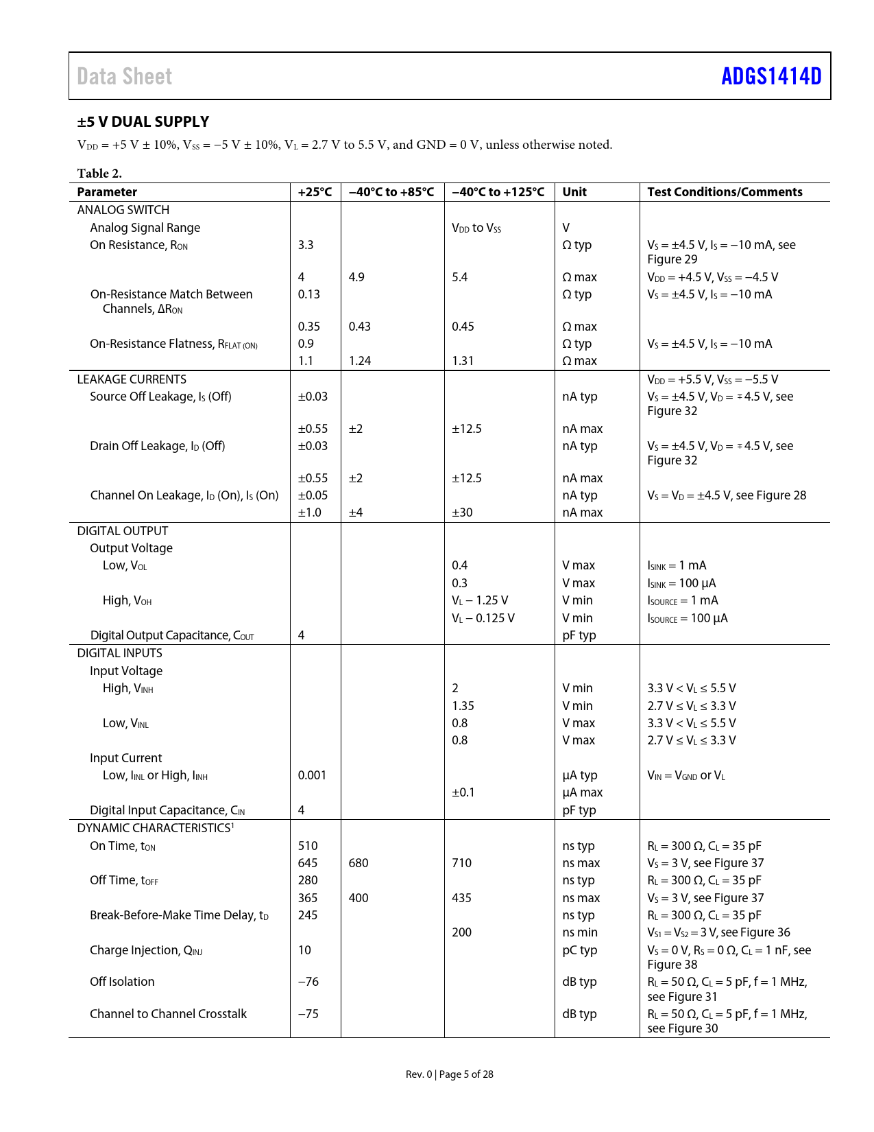Pages / Page28 / 5 — Data Sheet. ADGS1414D. ±5 V DUAL SUPPLY. Table 2. Parameter. +25°C −40°C …