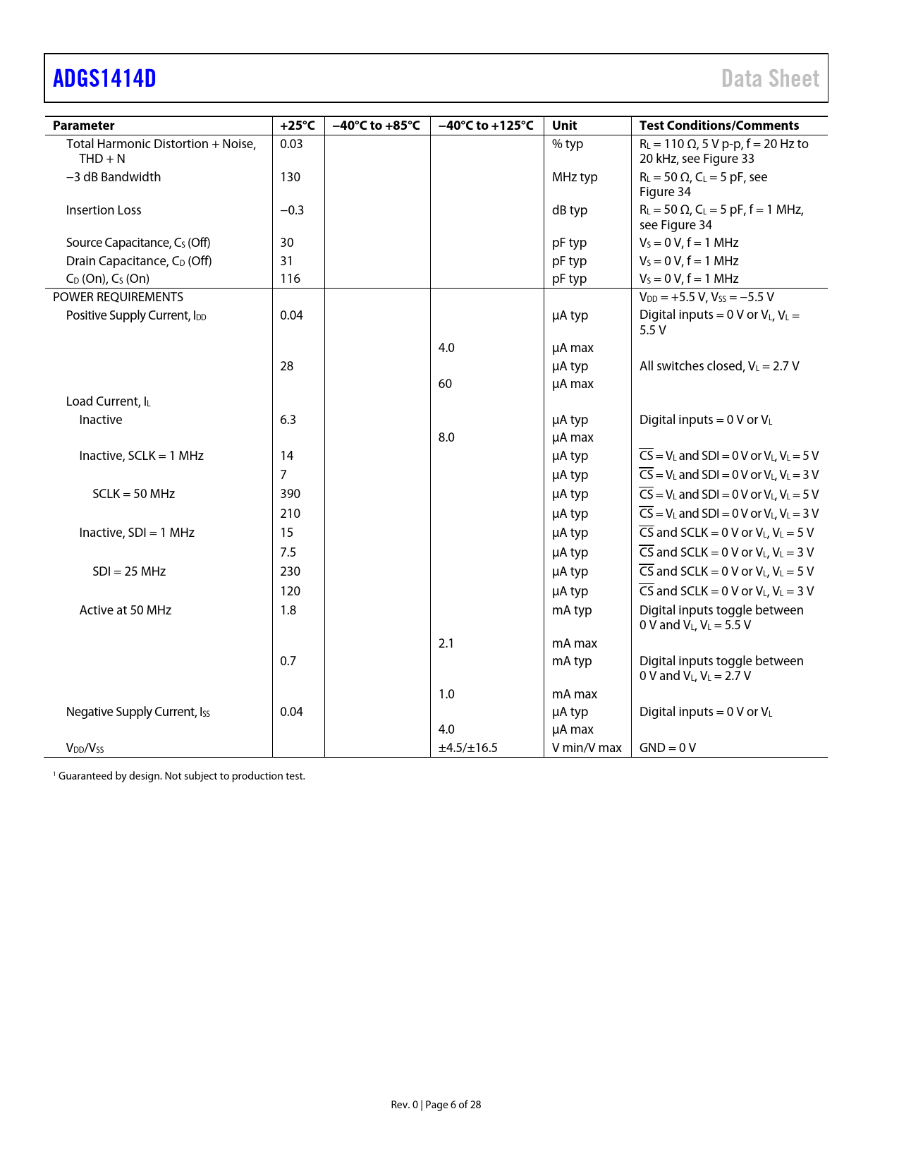 link to page 17 link to page 17 link to page 17 ADGS1414DData SheetParameter+25°C −40°C to +85°C−40°C to +125°CUnitTest Conditions/Comments Total Harmonic Distortion + Noise, 0.03 % typ RL = 110 Ω, 5 V p-p, f = 20 Hz to THD + N 20 kHz, see Figure 33 −3 dB Bandwidth 130 MHz typ RL = 50 Ω, CL = 5 pF, see Figure 34 Insertion Loss −0.3 dB typ RL = 50 Ω, CL = 5 pF, f = 1 MHz, see Figure 34 Source Capacitance, CS (Off) 30 pF typ VS = 0 V, f = 1 MHz Drain Capacitance, CD (Off) 31 pF typ VS = 0 V, f = 1 MHz CD (On), CS (On) 116 pF typ VS = 0 V, f = 1 MHz POWER REQUIREMENTS VDD = +5.5 V, VSS = −5.5 V Positive Supply Current, IDD 0.04 µA typ Digital inputs = 0 V or VL, VL = 5.5 V 4.0 µA max 28 µA typ All switches closed, VL = 2.7 V 60 µA max Load Current, IL Inactive 6.3 µA typ Digital inputs = 0 V or VL 8.0 µA max Inactive, SCLK = 1 MHz 14 µA typ CS = VL and SDI = 0 V or VL, VL = 5 V 7 µA typ CS = VL and SDI = 0 V or VL, VL = 3 V SCLK = 50 MHz 390 µA typ CS = VL and SDI = 0 V or VL, VL = 5 V 210 µA typ CS = VL and SDI = 0 V or VL, VL = 3 V Inactive, SDI = 1 MHz 15 µA typ CS and SCLK = 0 V or VL, VL = 5 V 7.5 µA typ CS and SCLK = 0 V or VL, VL = 3 V SDI = 25 MHz 230 µA typ CS and SCLK = 0 V or VL, VL = 5 V 120 µA typ CS and SCLK = 0 V or VL, VL = 3 V Active at 50 MHz 1.8 mA typ Digital inputs toggle between 0 V and VL, VL = 5.5 V 2.1 mA max 0.7 mA typ Digital inputs toggle between 0 V and VL, VL = 2.7 V 1.0 mA max Negative Supply Current, ISS 0.04 µA typ Digital inputs = 0 V or VL 4.0 µA max VDD/VSS ±4.5/±16.5 V min/V max GND = 0 V 1 Guaranteed by design. Not subject to production test. Rev. 0 | Page 6 of 28 Document Outline Features Applications General Description Functional Block Diagram Product Highlights Revision History Specifications ±15 V Dual Supply ±5 V Dual Supply 12 V Single Supply Continuous Current per Channel, Sx or Dx Timing Characteristics Timing Diagrams Absolute Maximum Ratings Thermal Resistance Electrostatic Discharge (ESD) Ratings ESD Ratings for ADGS1414D ESD Caution Pin Configuration and Function Descriptions Typical Performance Characteristics Test Circuits Terminology Theory of Operation Address Mode Error Detection Features Cyclic Redundancy Check (CRC) Error Detection SCLK Count Error Detection Invalid Read and Write Address Error Clearing the Error Flags Register Burst Mode Software Reset Daisy-Chain Mode Power-On Reset Applications Information System Channel Density Route Through Pins Integrated Passive Components Break-Before-Make Switching Digital Input Buffers Power Supply Rails Power Supply Recommendations 1.8 V Logic Compatibility Register Summary Register Details Switch Data Register Error Configuration Register Error Flags Register Burst Enable Register Software Reset Register Outline Dimensions Ordering Guide