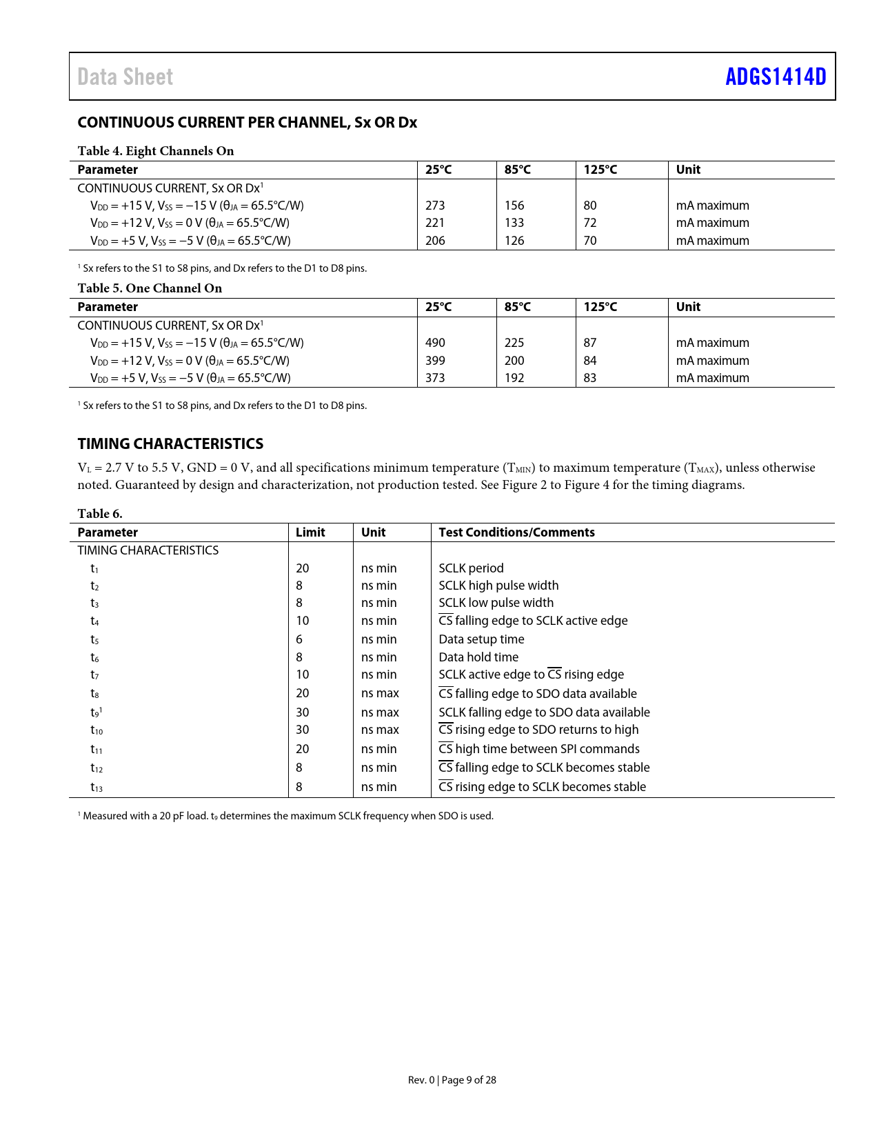 TIMING CHARACTERISTICS t1 20 ns min SCLK period t2 8 ns min SCLK high pulse width t3 8 ns min SCLK low pulse width t4 10 ns min CS falling edge to SCLK active edge t5 6 ns min Data setup time t6 8 ns min Data hold time t7 10 ns min SCLK active edge to CS rising edge t8 20 ns max CS falling edge to SDO data available t 1 9 30 ns max SCLK falling edge to SDO data available t10 30 ns max CS rising edge to SDO returns to high t11 20 ns min CS high time between SPI commands t12 8 ns min CS falling edge to SCLK becomes stable t13 8 ns min CS rising edge to SCLK becomes stable 1 Measured with a 20 pF load. t9 determines the maximum SCLK frequency when SDO is used. Rev. 0 | Page 9 of 28 Document Outline Features Applications General Description Functional Block Diagram Product Highlights Revision History Specifications ±15 V Dual Supply ±5 V Dual Supply 12 V Single Supply Continuous Current per Channel, Sx or Dx Timing Characteristics Timing Diagrams Absolute Maximum Ratings Thermal Resistance Electrostatic Discharge (ESD) Ratings ESD Ratings for ADGS1414D ESD Caution Pin Configuration and Function Descriptions Typical Performance Characteristics Test Circuits Terminology Theory of Operation Address Mode Error Detection Features Cyclic Redundancy Check (CRC) Error Detection SCLK Count Error Detection Invalid Read and Write Address Error Clearing the Error Flags Register Burst Mode Software Reset Daisy-Chain Mode Power-On Reset Applications Information System Channel Density Route Through Pins Integrated Passive Components Break-Before-Make Switching Digital Input Buffers Power Supply Rails Power Supply Recommendations 1.8 V Logic Compatibility Register Summary Register Details Switch Data Register Error Configuration Register Error Flags Register Burst Enable Register Software Reset Register Outline Dimensions Ordering Guide