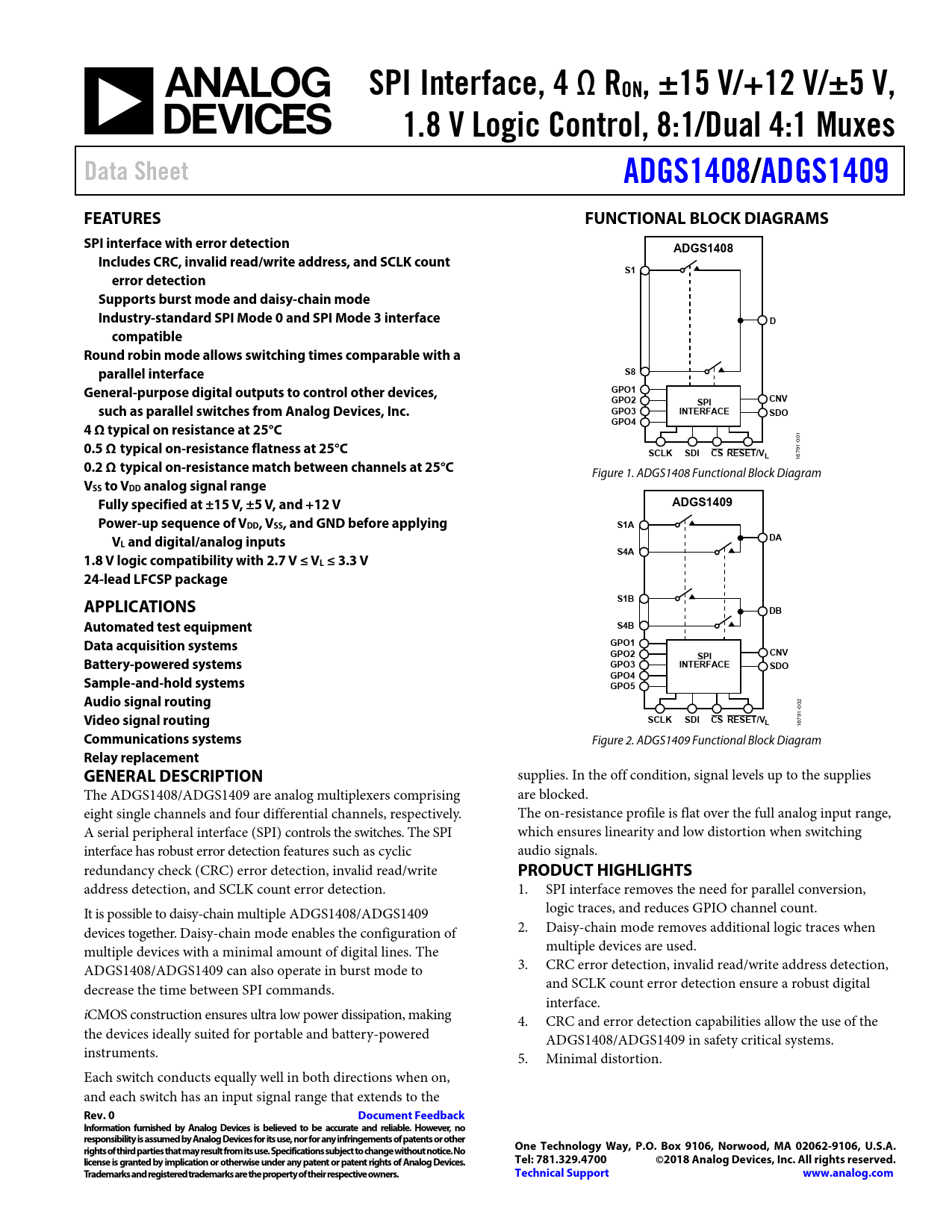 SPI Interface, 4 Ω RON, ±15 V/+12 V/±5 V,. 1.8 V Logic Control, 8:1/Dual 4:1 Muxes. Data Sheet. ADGS1408/. ADGS1409. FEATURES