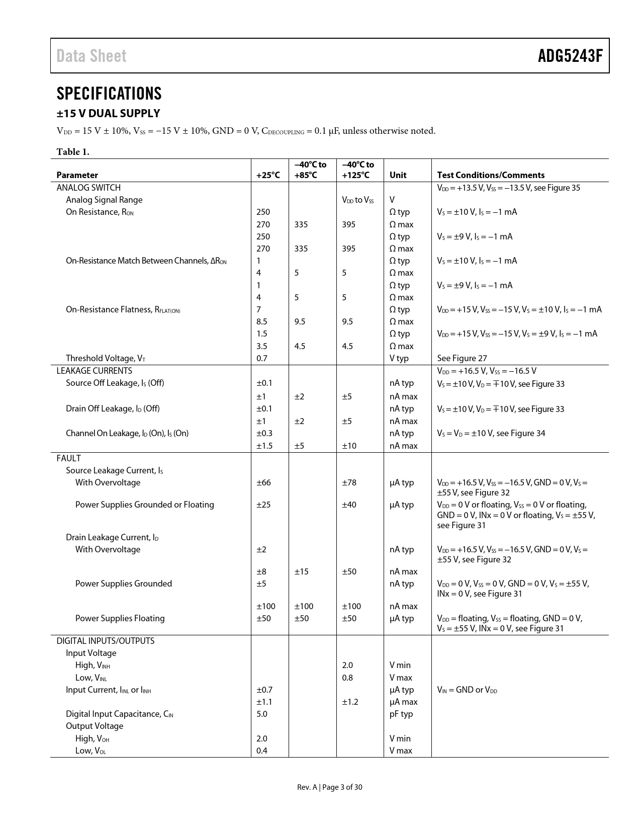 Pages / Page30 / 3 — Data Sheet. ADG5243F. SPECIFICATIONS ±15 V DUAL SUPPLY. Table 1. −40°C …