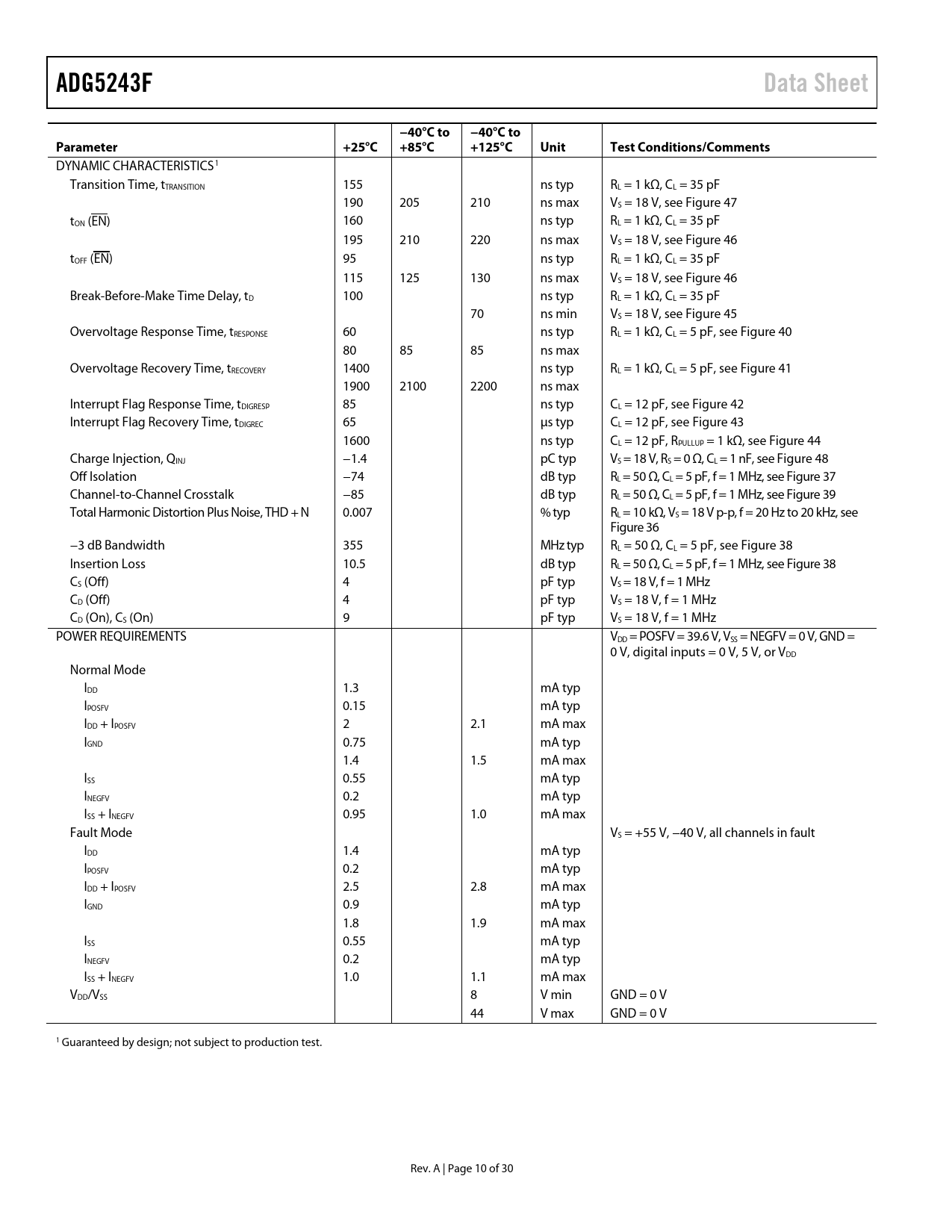 link to page 23 link to page 23 link to page 23 link to page 22 link to page 21 link to page 21 link to page 21 link to page 22 link to page 22 link to page 23 link to page 20 link to page 20 link to page 20 link to page 20 link to page 20 link to page 14 ADG5243FData Sheet−40°C to−40°C toParameter+25°C+85°C+125°CUnitTest Conditions/Comments DYNAMIC CHARACTERISTICS1 Transition Time, tTRANSITION 155 ns typ RL = 1 kΩ, CL = 35 pF 190 205 210 ns max VS = 18 V, see Figure 47 tON (EN) 160 ns typ RL = 1 kΩ, CL = 35 pF 195 210 220 ns max VS = 18 V, see Figure 46 tOFF (EN) 95 ns typ RL = 1 kΩ, CL = 35 pF 115 125 130 ns max VS = 18 V, see Figure 46 Break-Before-Make Time Delay, tD 100 ns typ RL = 1 kΩ, CL = 35 pF 70 ns min VS = 18 V, see Figure 45 Overvoltage Response Time, tRESPONSE 60 ns typ RL = 1 kΩ, CL = 5 pF, see Figure 40 80 85 85 ns max Overvoltage Recovery Time, tRECOVERY 1400 ns typ RL = 1 kΩ, CL = 5 pF, see Figure 41 1900 2100 2200 ns max Interrupt Flag Response Time, tDIGRESP 85 ns typ CL = 12 pF, see Figure 42 Interrupt Flag Recovery Time, tDIGREC 65 µs typ CL = 12 pF, see Figure 43 1600 ns typ CL = 12 pF, RPULLUP = 1 kΩ, see Figure 44 Charge Injection, QINJ −1.4 pC typ VS = 18 V, RS = 0 Ω, CL = 1 nF, see Figure 48 Off Isolation −74 dB typ RL = 50 Ω, CL = 5 pF, f = 1 MHz, see Figure 37 Channel-to-Channel Crosstalk −85 dB typ RL = 50 Ω, CL = 5 pF, f = 1 MHz, see Figure 39 Total Harmonic Distortion Plus Noise, THD + N 0.007 % typ RL = 10 kΩ, VS = 18 V p-p, f = 20 Hz to 20 kHz, see Figure 36 −3 dB Bandwidth 355 MHz typ RL = 50 Ω, CL = 5 pF, see Figure 38 Insertion Loss 10.5 dB typ RL = 50 Ω, CL = 5 pF, f = 1 MHz, see Figure 38 CS (Off) 4 pF typ VS = 18 V, f = 1 MHz CD (Off) 4 pF typ VS = 18 V, f = 1 MHz CD (On), CS (On) 9 pF typ VS = 18 V, f = 1 MHz POWER REQUIREMENTS VDD = POSFV = 39.6 V, VSS = NEGFV = 0 V, GND = 0 V, digital inputs = 0 V, 5 V, or VDD Normal Mode IDD 1.3 mA typ IPOSFV 0.15 mA typ IDD + IPOSFV 2 2.1 mA max IGND 0.75 mA typ 1.4 1.5 mA max ISS 0.55 mA typ INEGFV 0.2 mA typ ISS + INEGFV 0.95 1.0 mA max Fault Mode VS = +55 V, −40 V, all channels in fault IDD 1.4 mA typ IPOSFV 0.2 mA typ IDD + IPOSFV 2.5 2.8 mA max IGND 0.9 mA typ 1.8 1.9 mA max ISS 0.55 mA typ INEGFV 0.2 mA typ ISS + INEGFV 1.0 1.1 mA max VDD/VSS 8 V min GND = 0 V 44 V max GND = 0 V 1 Guaranteed by design; not subject to production test. Rev. A | Page 10 of 30 Document Outline FEATURES APPLICATIONS FUNCTIONAL BLOCK DIAGRAM GENERAL DESCRIPTION PRODUCT HIGHLIGHTS REVISION HISTORY SPECIFICATIONS ±15 V DUAL SUPPLY ±20 V DUAL SUPPLY 12 V SINGLE SUPPLY 36 V SINGLE SUPPLY CONTINUOUS CURRENT PER CHANNEL, Sx OR Dx ABSOLUTE MAXIMUM RATINGS ESD CAUTION PIN CONFIGURATIONS AND FUNCTION DESCRIPTIONS TYPICAL PERFORMANCE CHARACTERISTICS TEST CIRCUITS TERMINOLOGY THEORY OF OPERATION SWITCH ARCHITECTURE ESD Performance Trench Isolation USER DEFINED FAULT PROTECTION Power-On Protection Power-Off Protection Digital Input Protection Overvoltage Interrupt Flag APPLICATIONS INFORMATION POWER SUPPLY RAILS POWER SUPPLY SEQUENCING PROTECTION SIGNAL RANGE POWER SUPPLY RECOMMENDATIONS HIGH VOLTAGE SURGE SUPPRESSION INTELLIGENT FAULT DETECTION LARGE VOLTAGE, HIGH FREQUENCY SIGNALS OUTLINE DIMENSIONS ORDERING GUIDE