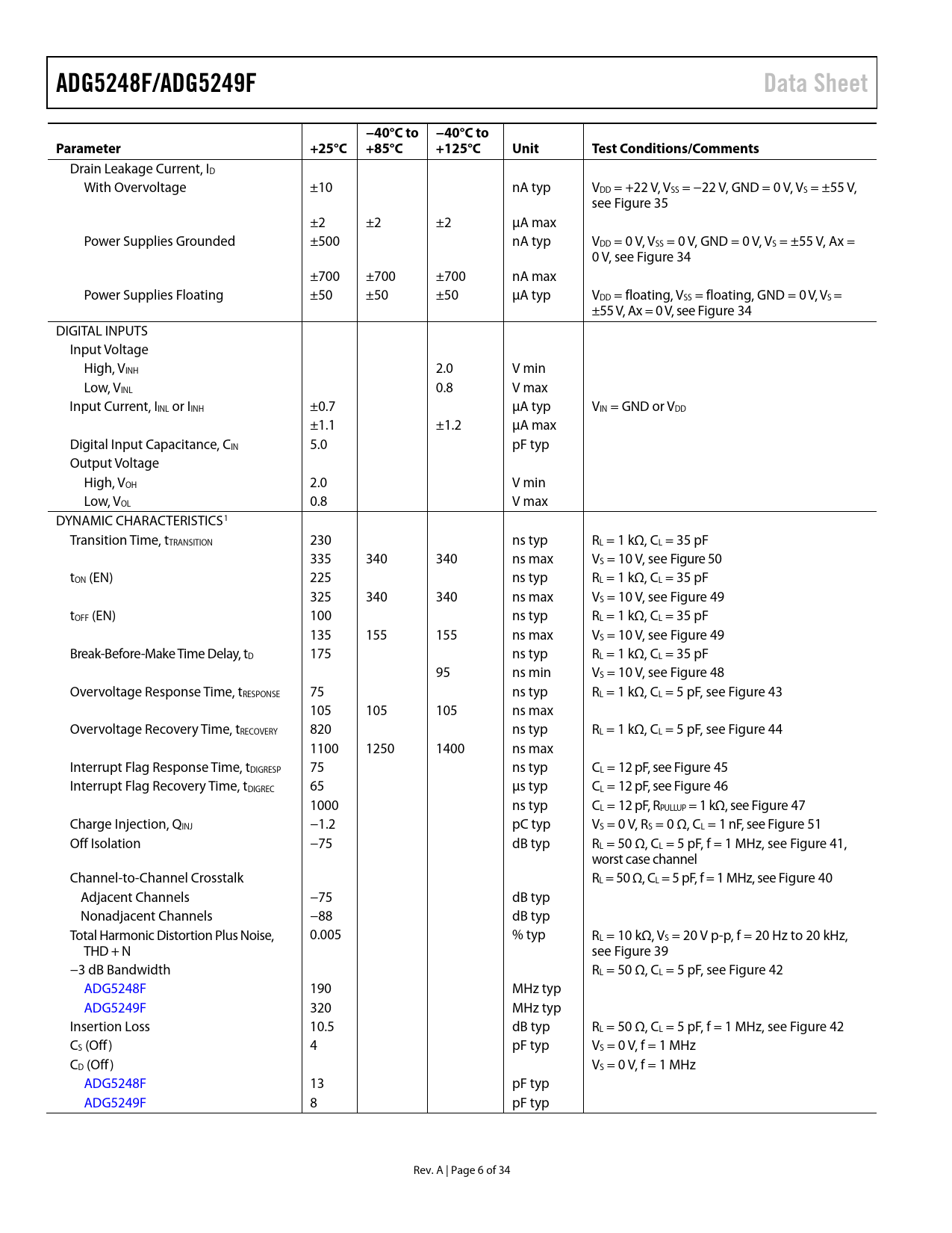 link to page 23 link to page 23 link to page 23 link to page 27 link to page 26 link to page 26 link to page 26 link to page 24 link to page 25 link to page 25 link to page 25 link to page 26 link to page 27 link to page 24 link to page 23 link to page 23 link to page 24 link to page 24 link to page 7 ADG5248F/ADG5249FData Sheet−40°C to −40°C toParameter+25°C +85°C+125°CUnitTest Conditions/Comments Drain Leakage Current, ID With Overvoltage ±10 nA typ VDD = +22 V, VSS = −22 V, GND = 0 V, VS = ±55 V, see Figure 35 ±2 ±2 ±2 µA max Power Supplies Grounded ±500 nA typ VDD = 0 V, VSS = 0 V, GND = 0 V, VS = ±55 V, Ax = 0 V, see Figure 34 ±700 ±700 ±700 nA max Power Supplies Floating ±50 ±50 ±50 µA typ VDD = floating, VSS = floating, GND = 0 V, VS = ±55 V, Ax = 0 V, see Figure 34 DIGITAL INPUTS Input Voltage High, VINH 2.0 V min Low, VINL 0.8 V max Input Current, IINL or IINH ±0.7 µA typ VIN = GND or VDD ±1.1 ±1.2 µA max Digital Input Capacitance, CIN 5.0 pF typ Output Voltage High, VOH 2.0 V min Low, VOL 0.8 V max DYNAMIC CHARACTERISTICS1 Transition Time, tTRANSITION 230 ns typ RL = 1 kΩ, CL = 35 pF 335 340 340 ns max VS = 10 V, see Figure 50 tON (EN) 225 ns typ RL = 1 kΩ, CL = 35 pF 325 340 340 ns max VS = 10 V, see Figure 49 tOFF (EN) 100 ns typ RL = 1 kΩ, CL = 35 pF 135 155 155 ns max VS = 10 V, see Figure 49 Break-Before-Make Time Delay, tD 175 ns typ RL = 1 kΩ, CL = 35 pF 95 ns min VS = 10 V, see Figure 48 Overvoltage Response Time, tRESPONSE 75 ns typ RL = 1 kΩ, CL = 5 pF, see Figure 43 105 105 105 ns max Overvoltage Recovery Time, tRECOVERY 820 ns typ RL = 1 kΩ, CL = 5 pF, see Figure 44 1100 1250 1400 ns max Interrupt Flag Response Time, tDIGRESP 75 ns typ CL = 12 pF, see Figure 45 Interrupt Flag Recovery Time, tDIGREC 65 µs typ CL = 12 pF, see Figure 46 1000 ns typ CL = 12 pF, RPULLUP = 1 kΩ, see Figure 47 Charge Injection, QINJ −1.2 pC typ VS = 0 V, RS = 0 Ω, CL = 1 nF, see Figure 51 Off Isolation −75 dB typ RL = 50 Ω, CL = 5 pF, f = 1 MHz, see Figure 41, worst case channel Channel-to-Channel Crosstalk RL = 50 Ω, CL = 5 pF, f = 1 MHz, see Figure 40 Adjacent Channels −75 dB typ Nonadjacent Channels −88 dB typ Total Harmonic Distortion Plus Noise, 0.005 % typ RL = 10 kΩ, VS = 20 V p-p, f = 20 Hz to 20 kHz, THD + N see Figure 39 −3 dB Bandwidth RL = 50 Ω, CL = 5 pF, see Figure 42 ADG5248F 190 MHz typ ADG5249F 320 MHz typ Insertion Loss 10.5 dB typ RL = 50 Ω, CL = 5 pF, f = 1 MHz, see Figure 42 CS (Off) 4 pF typ VS = 0 V, f = 1 MHz CD (Off) VS = 0 V, f = 1 MHz ADG5248F 13 pF typ ADG5249F 8 pF typ Rev. A | Page 6 of 34 Document Outline FEATURES APPLICATIONS FUNCTIONAL BLOCK DIAGRAMS GENERAL DESCRIPTION PRODUCT HIGHLIGHTS TABLE OF CONTENTS REVISION HISTORY SPECIFICATIONS ±15 V DUAL SUPPLY ±20 V DUAL SUPPLY 12 V SINGLE SUPPLY 36 V SINGLE SUPPLY CONTINUOUS CURRENT PER CHANNEL, Sx, D, OR Dx ABSOLUTE MAXIMUM RATINGS ESD CAUTION PIN CONFIGURATIONS AND FUNCTION DESCRIPTIONS TYPICAL PERFORMANCE CHARACTERISTICS TEST CIRCUITS TERMINOLOGY THEORY OF OPERATION SWITCH ARCHITECTURE ESD Performance Trench Isolation USER DEFINED FAULT PROTECTION Power-On Protection Power-Off Protection Digital Input Protection Overvoltage Interrupt Flag APPLICATIONS INFORMATION POWER SUPPLY RAILS POWER SUPPLY SEQUENCING PROTECTION SIGNAL RANGE POWER SUPPLY RECOMMENDATIONS HIGH VOLTAGE SURGE SUPPRESSION INTELLIGENT FAULT DETECTION LARGE VOLTAGE, HIGH FREQUENCY SIGNALS OUTLINE DIMENSIONS ORDERING GUIDE