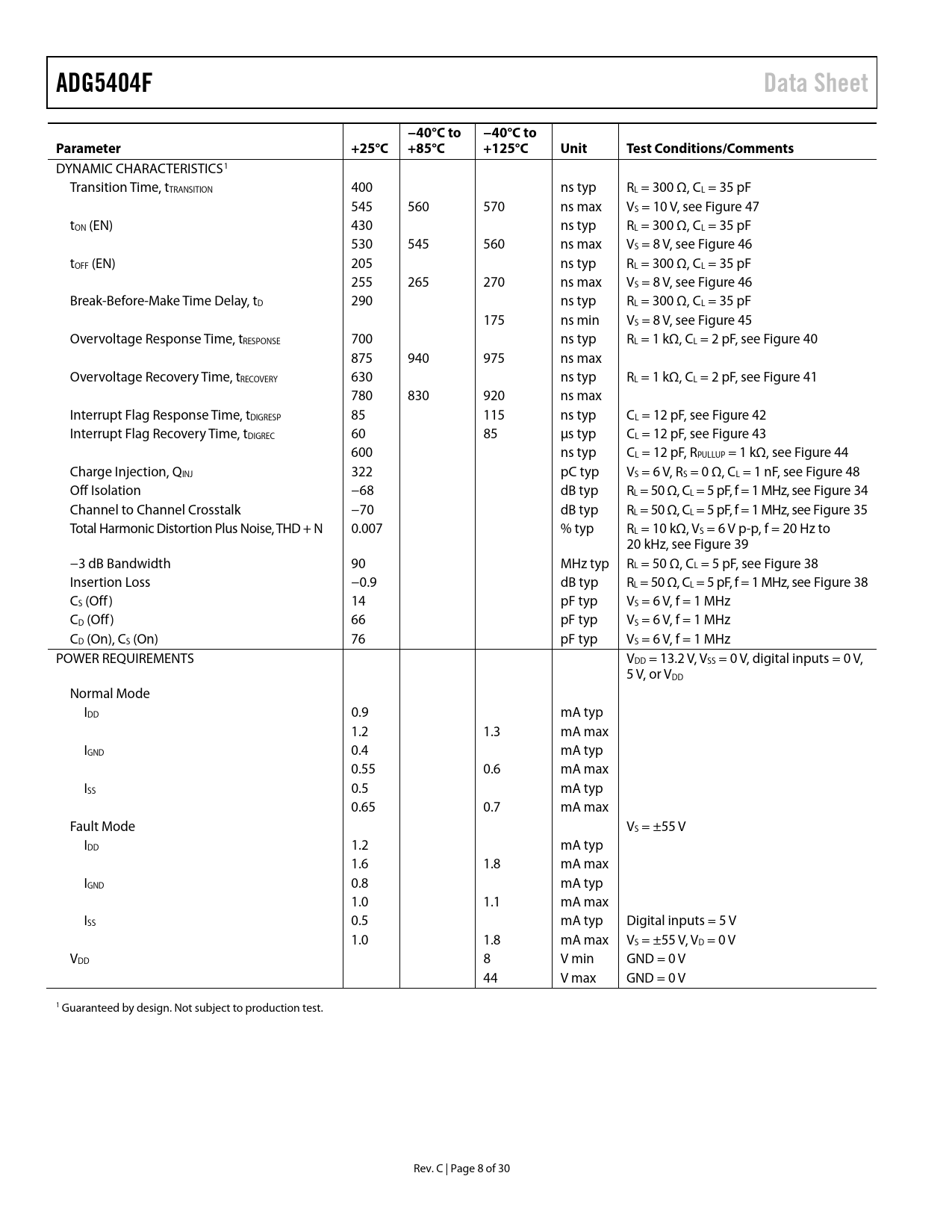 Pages / Page30 / 8 — ADG5404F. Data Sheet. −40°C to. Parameter. +25°C. +85°C. +125°C. Unit. …