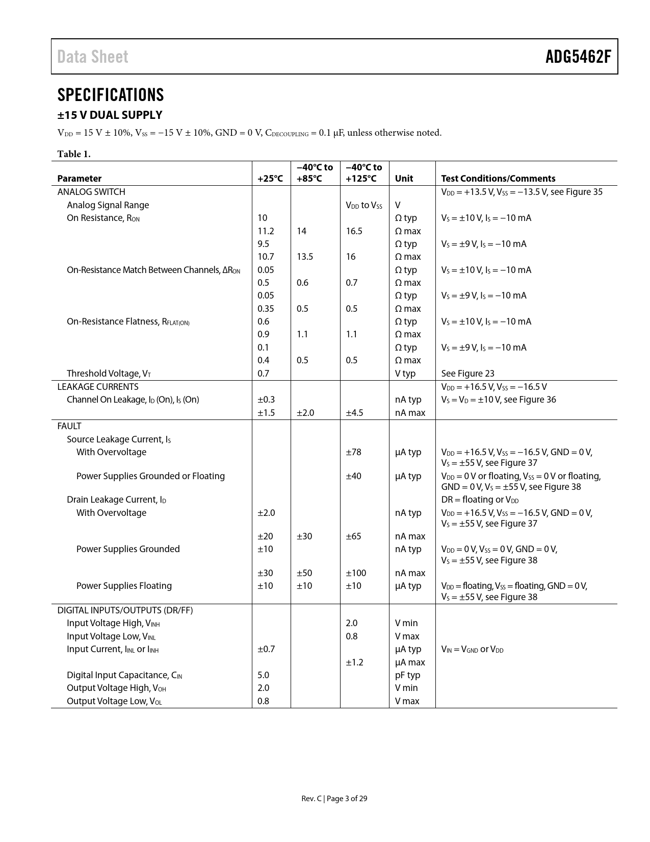 Data Sheet. ADG5462F. SPECIFICATIONS ±15 V DUAL SUPPLY. Table 1. −40°C to −40°C to. Parameter. +25°C +85°C. +125°C. Unit