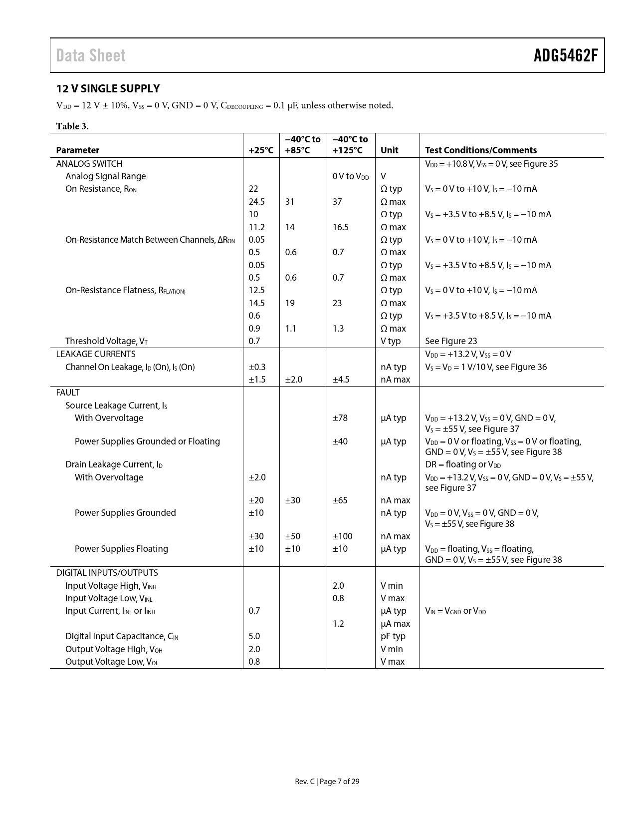 Data Sheet. ADG5462F. 12 V SINGLE SUPPLY. Table 3. −40°C to −40°C to. Parameter. +25°C +85°C. +125°C. Unit. Test Conditions/Comments