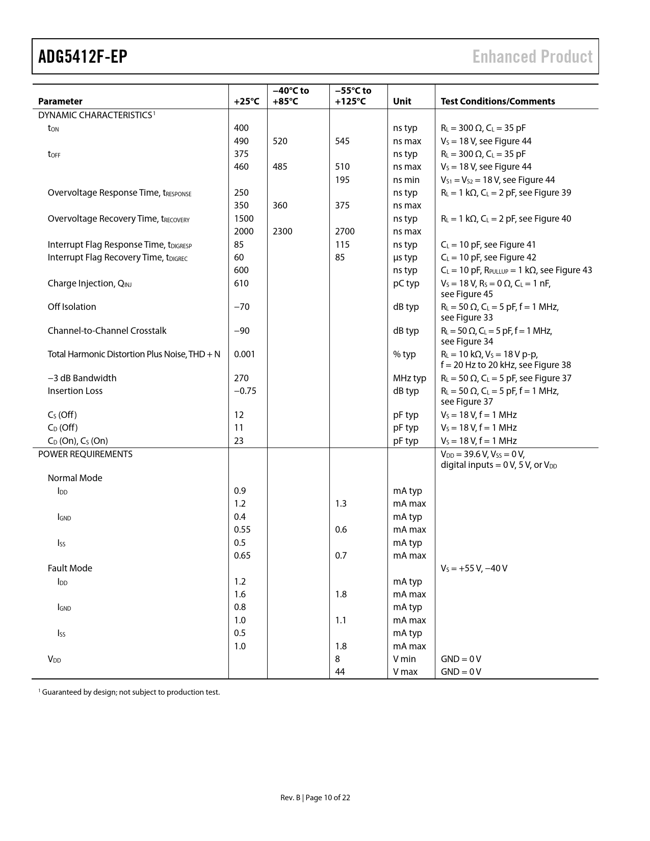 link to page 21 link to page 21 link to page 21 link to page 20 link to page 20 link to page 20 link to page 21 link to page 21 link to page 21 link to page 19 link to page 19 link to page 19 link to page 19 link to page 19 ADG5412F-EPEnhanced Product−40°C to−55°C toParameter+25°C+85°C+125°CUnitTest Conditions/Comments DYNAMIC CHARACTERISTICS1 tON 400 ns typ RL = 300 Ω, CL = 35 pF 490 520 545 ns max VS = 18 V, see Figure 44 tOFF 375 ns typ RL = 300 Ω, CL = 35 pF 460 485 510 ns max VS = 18 V, see Figure 44 195 ns min VS1 = VS2 = 18 V, see Figure 44 Overvoltage Response Time, tRESPONSE 250 ns typ RL = 1 kΩ, CL = 2 pF, see Figure 39 350 360 375 ns max Overvoltage Recovery Time, tRECOVERY 1500 ns typ RL = 1 kΩ, CL = 2 pF, see Figure 40 2000 2300 2700 ns max Interrupt Flag Response Time, tDIGRESP 85 115 ns typ CL = 10 pF, see Figure 41 Interrupt Flag Recovery Time, tDIGREC 60 85 µs typ CL = 10 pF, see Figure 42 600 ns typ CL = 10 pF, RPULLUP = 1 kΩ, see Figure 43 Charge Injection, QINJ 610 pC typ VS = 18 V, RS = 0 Ω, CL = 1 nF, see Figure 45 Off Isolation −70 dB typ RL = 50 Ω, CL = 5 pF, f = 1 MHz, see Figure 33 Channel-to-Channel Crosstalk −90 dB typ RL = 50 Ω, CL = 5 pF, f = 1 MHz, see Figure 34 Total Harmonic Distortion Plus Noise, THD + N 0.001 % typ RL = 10 kΩ, VS = 18 V p-p, f = 20 Hz to 20 kHz, see Figure 38 −3 dB Bandwidth 270 MHz typ RL = 50 Ω, CL = 5 pF, see Figure 37 Insertion Loss −0.75 dB typ RL = 50 Ω, CL = 5 pF, f = 1 MHz, see Figure 37 CS (Off) 12 pF typ VS = 18 V, f = 1 MHz CD (Off) 11 pF typ VS = 18 V, f = 1 MHz CD (On), CS (On) 23 pF typ VS = 18 V, f = 1 MHz POWER REQUIREMENTS VDD = 39.6 V, VSS = 0 V, digital inputs = 0 V, 5 V, or VDD Normal Mode IDD 0.9 mA typ 1.2 1.3 mA max IGND 0.4 mA typ 0.55 0.6 mA max ISS 0.5 mA typ 0.65 0.7 mA max Fault Mode VS = +55 V, −40 V IDD 1.2 mA typ 1.6 1.8 mA max IGND 0.8 mA typ 1.0 1.1 mA max ISS 0.5 mA typ 1.0 1.8 mA max VDD 8 V min GND = 0 V 44 V max GND = 0 V 1 Guaranteed by design; not subject to production test. Rev. B | Page 10 of 22 Document Outline FEATURES ENHANCED PRODUCT FEATURES APPLICATIONS FUNCTIONAL BLOCK DIAGRAM GENERAL DESCRIPTION PRODUCT HIGHLIGHTS REVISION HISTORY SPECIFICATIONS ±15 V DUAL SUPPLY ±20 V DUAL SUPPLY 12 V SINGLE SUPPLY 36 V SINGLE SUPPLY CONTINUOUS CURRENT PER CHANNEL, Sx OR Dx ABSOLUTE MAXIMUM RATINGS ESD CAUTION PIN CONFIGURATION AND FUNCTION DESCRIPTIONS TYPICAL PERFORMANCE CHARACTERISTICS TEST CIRCUITS OUTLINE DIMENSIONS ORDERING GUIDE