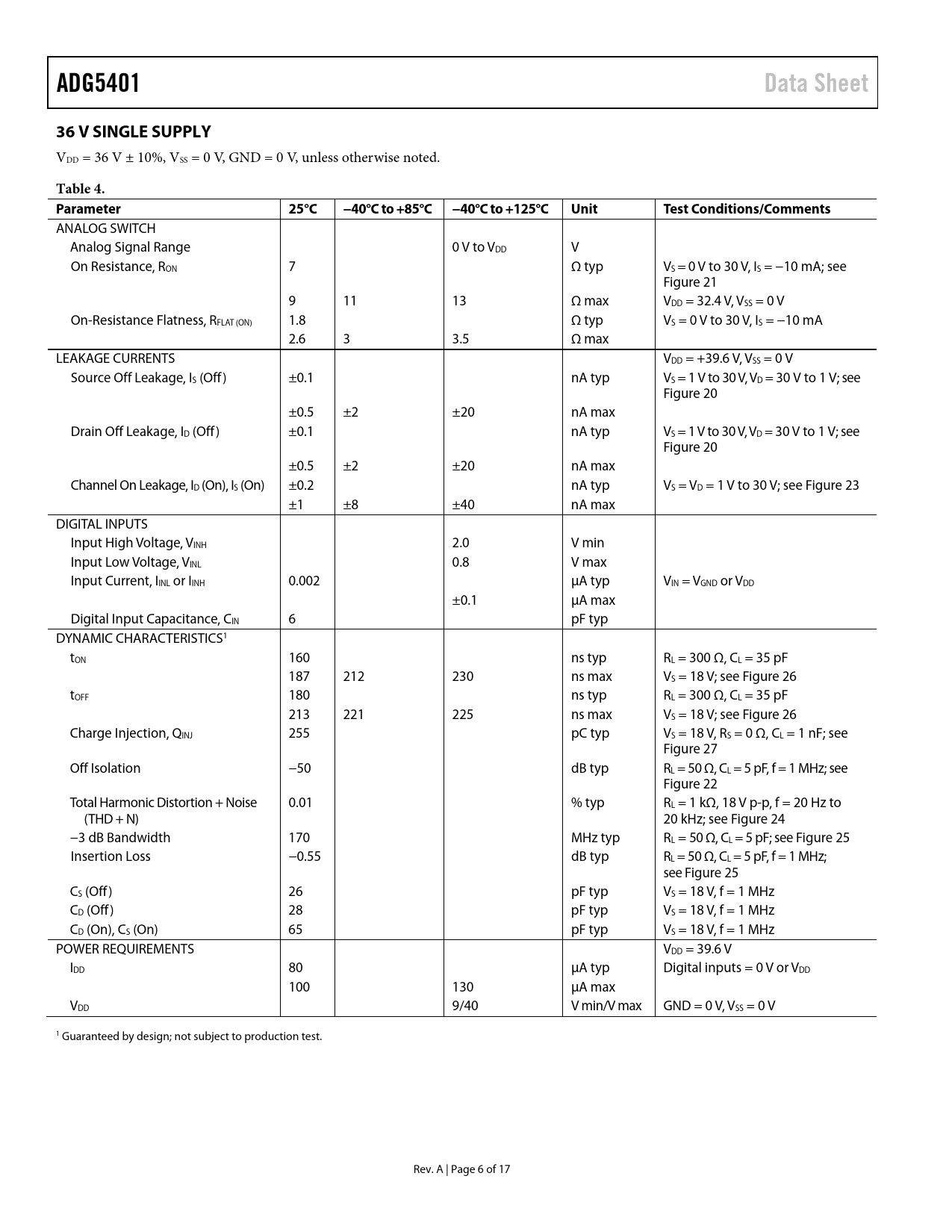 ADG5401. Data Sheet. 36 V SINGLE SUPPLY. Table 4. Parameter. 25°C. −40°C to +85°C. −40°C to +125°C. Unit. Test Conditions/Comments