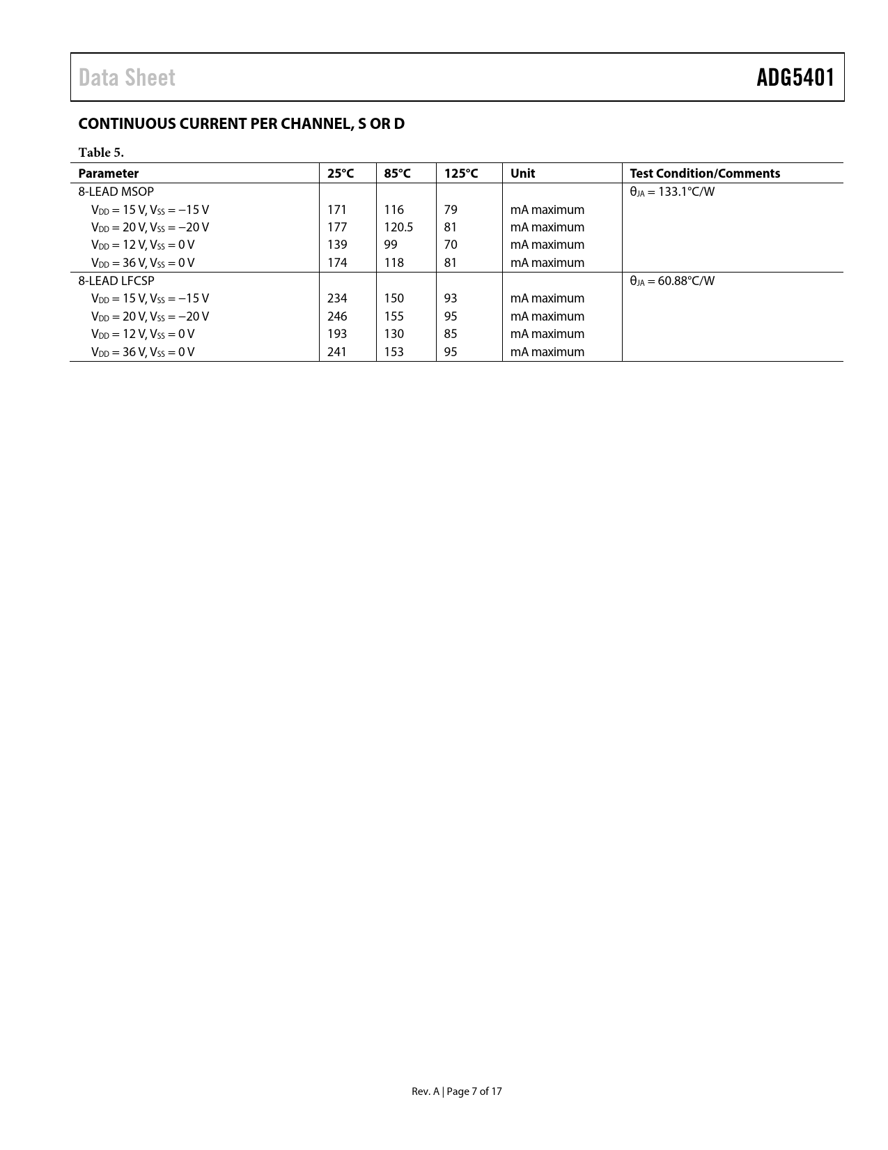 Pages / Page17 / 7 — Data Sheet. ADG5401. CONTINUOUS CURRENT PER CHANNEL, S OR D. Table 5. …