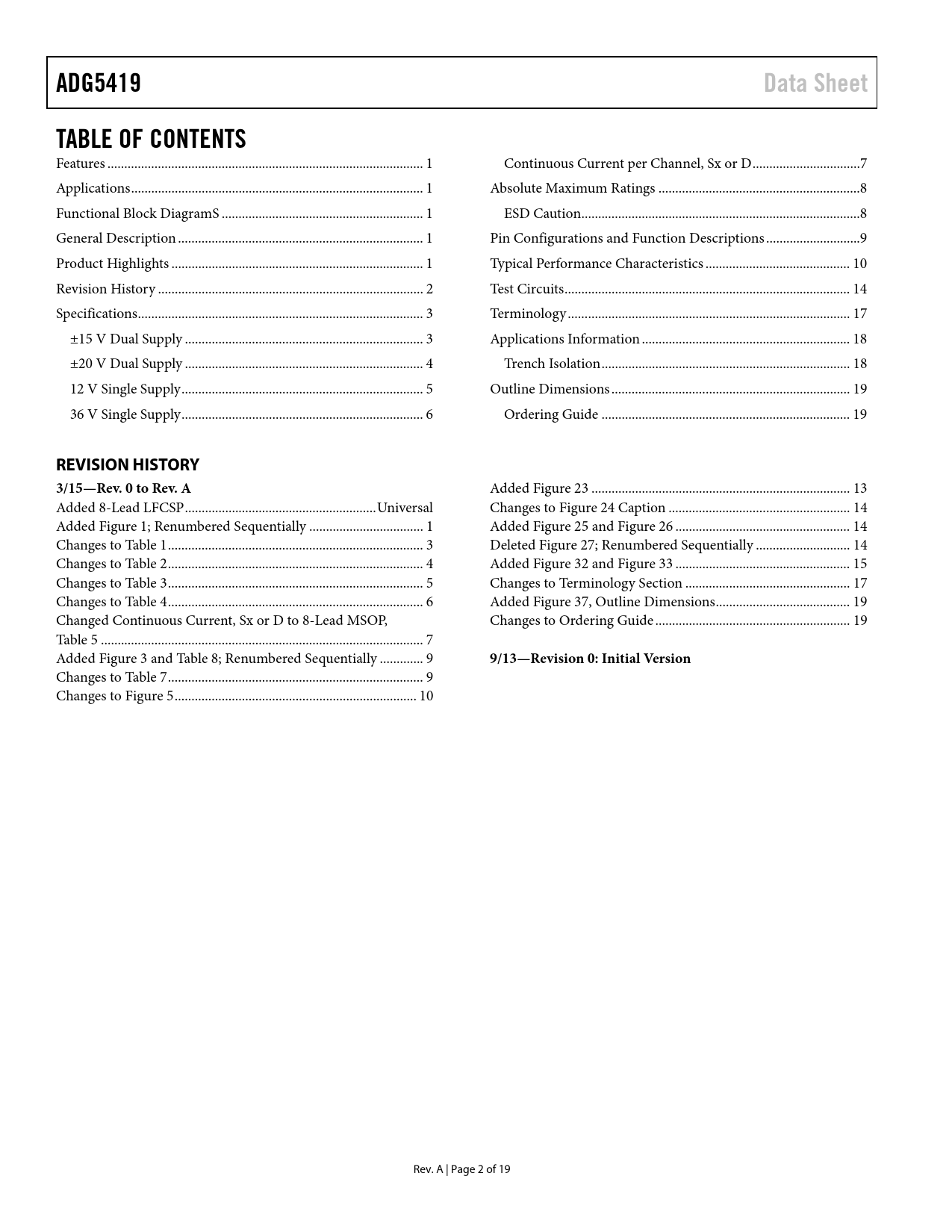 link to page 1 link to page 1 link to page 1 link to page 1 link to page 1 link to page 2 link to page 3 link to page 3 link to page 4 link to page 5 link to page 5 link to page 7 link to page 8 link to page 8 link to page 9 link to page 10 link to page 14 link to page 17 link to page 18 link to page 18 link to page 19 link to page 19 ADG5419Data SheetTABLE OF CONTENTS Features .. 1 Continuous Current per Channel, Sx or D ..7 Applications ... 1 Absolute Maximum Ratings ..8 Functional Block DiagramS .. 1 ESD Caution...8 General Description ... 1 Pin Configurations and Function Descriptions ..9 Product Highlights ... 1 Typical Performance Characteristics ... 10 Revision History ... 2 Test Circuits ... 14 Specifications ... 3 Terminology .. 17 ±15 V Dual Supply ... 3 Applications Information .. 18 ±20 V Dual Supply ... 4 Trench Isolation .. 18 12 V Single Supply .. 5 Outline Dimensions ... 19 36 V Single Supply .. 6 Ordering Guide .. 19 REVISION HISTORY3/15—Rev. 0 to Rev. A Added Figure 23 ... 13 Added 8-Lead LFCSP ... Universal Changes to Figure 24 Caption .. 14 Added Figure 1; Renumbered Sequentially .. 1 Added Figure 25 and Figure 26 .. 14 Changes to Table 1 .. 3 Deleted Figure 27; Renumbered Sequentially .. 14 Changes to Table 2 .. 4 Added Figure 32 and Figure 33 .. 15 Changes to Table 3 .. 5 Changes to Terminology Section ... 17 Changes to Table 4 .. 6 Added Figure 37, Outline Dimensions .. 19 Changed Continuous Current, Sx or D to 8-Lead MSOP, Changes to Ordering Guide .. 19 Table 5 .. 7 Added Figure 3 and Table 8; Renumbered Sequentially ... 9 9/13—Revision 0: Initial Version Changes to Table 7 .. 9 Changes to Figure 5 .. 10 Rev. A | Page 2 of 19 Document Outline FEATURES APPLICATIONS FUNCTIONAL BLOCK DIAGRAMS GENERAL DESCRIPTION PRODUCT HIGHLIGHTS TABLE OF CONTENTS REVISION HISTORY SPECIFICATIONS ±15 V DUAL SUPPLY ±20 V DUAL SUPPLY 12 V SINGLE SUPPLY 36 V SINGLE SUPPLY CONTINUOUS CURRENT PER CHANNEL, Sx OR D ABSOLUTE MAXIMUM RATINGS ESD CAUTION PIN CONFIGURATIONS AND FUNCTION DESCRIPTIONS TYPICAL PERFORMANCE CHARACTERISTICS TEST CIRCUITS TERMINOLOGY APPLICATIONS INFORMATION TRENCH ISOLATION OUTLINE DIMENSIONS ORDERING GUIDE