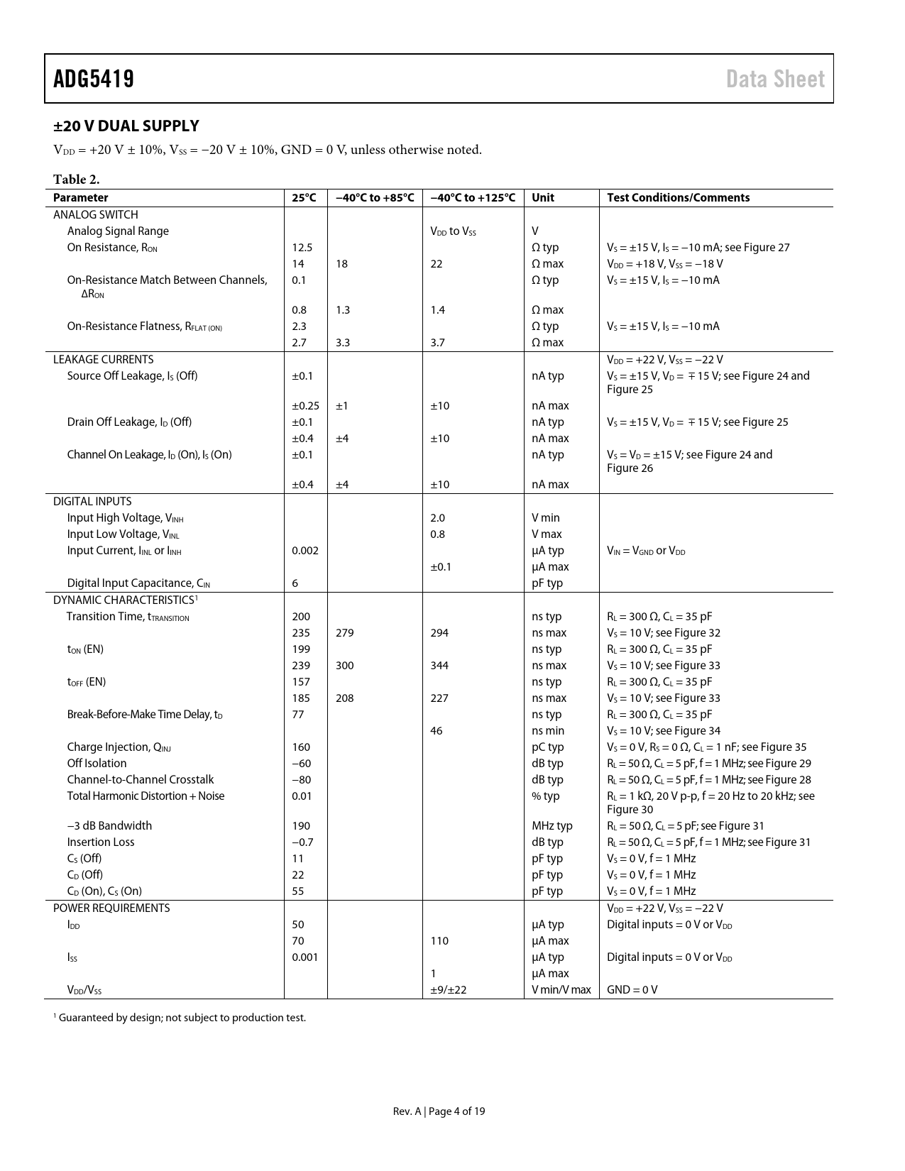 link to page 14 link to page 14 link to page 14 link to page 14 link to page 14 link to page 14 link to page 15 link to page 15 link to page 15 link to page 16 link to page 16 link to page 14 link to page 14 link to page 15 link to page 15 link to page 15 ADG5419Data Sheet±20 V DUAL SUPPLY VDD = +20 V ± 10%, VSS = −20 V ± 10%, GND = 0 V, unless otherwise noted. Table 2. Parameter25°C−40°C to +85°C−40°C to +125°C UnitTestConditions/Comments ANALOG SWITCH Analog Signal Range VDD to VSS V On Resistance, RON 12.5 Ω typ VS = ±15 V, IS = −10 mA; see Figure 27 14 18 22 Ω max VDD = +18 V, VSS = −18 V On-Resistance Match Between Channels, 0.1 Ω typ VS = ±15 V, IS = −10 mA ∆RON 0.8 1.3 1.4 Ω max On-Resistance Flatness, RFLAT (ON) 2.3 Ω typ VS = ±15 V, IS = −10 mA 2.7 3.3 3.7 Ω max LEAKAGE CURRENTS VDD = +22 V, VSS = −22 V Source Off Leakage, IS (Off) ±0.1 nA typ VS = ±15 V, VD = 15 V; see Figure 24 and Figure 25 ±0.25 ±1 ±10 nA max Drain Off Leakage, ID (Off) ±0.1 nA typ VS = ±15 V, VD = 15 V; see Figure 25 ±0.4 ±4 ±10 nA max Channel On Leakage, ID (On), IS (On) ±0.1 nA typ VS = VD = ±15 V; see Figure 24 and Figure 26 ±0.4 ±4 ±10 nA max DIGITAL INPUTS Input High Voltage, VINH 2.0 V min Input Low Voltage, VINL 0.8 V max Input Current, IINL or IINH 0.002 μA typ VIN = VGND or VDD ±0.1 μA max Digital Input Capacitance, CIN 6 pF typ DYNAMIC CHARACTERISTICS1 Transition Time, tTRANSITION 200 ns typ RL = 300 Ω, CL = 35 pF 235 279 294 ns max VS = 10 V; see Figure 32 tON (EN) 199 ns typ RL = 300 Ω, CL = 35 pF 239 300 344 ns max VS = 10 V; see Figure 33 tOFF (EN) 157 ns typ RL = 300 Ω, CL = 35 pF 185 208 227 ns max VS = 10 V; see Figure 33 Break-Before-Make Time Delay, tD 77 ns typ RL = 300 Ω, CL = 35 pF 46 ns min VS = 10 V; see Figure 34 Charge Injection, QINJ 160 pC typ VS = 0 V, RS = 0 Ω, CL = 1 nF; see Figure 35 Off Isolation −60 dB typ RL = 50 Ω, CL = 5 pF, f = 1 MHz; see Figure 29 Channel-to-Channel Crosstalk −80 dB typ RL = 50 Ω, CL = 5 pF, f = 1 MHz; see Figure 28 Total Harmonic Distortion + Noise 0.01 % typ RL = 1 kΩ, 20 V p-p, f = 20 Hz to 20 kHz; see Figure 30 −3 dB Bandwidth 190 MHz typ RL = 50 Ω, CL = 5 pF; see Figure 31 Insertion Loss −0.7 dB typ RL = 50 Ω, CL = 5 pF, f = 1 MHz; see Figure 31 CS (Off) 11 pF typ VS = 0 V, f = 1 MHz CD (Off) 22 pF typ VS = 0 V, f = 1 MHz CD (On), CS (On) 55 pF typ VS = 0 V, f = 1 MHz POWER REQUIREMENTS VDD = +22 V, VSS = −22 V IDD 50 μA typ Digital inputs = 0 V or VDD 70 110 μA max ISS 0.001 μA typ Digital inputs = 0 V or VDD 1 μA max VDD/VSS ±9/±22 V min/V max GND = 0 V 1 Guaranteed by design; not subject to production test. Rev. A | Page 4 of 19 Document Outline FEATURES APPLICATIONS FUNCTIONAL BLOCK DIAGRAMS GENERAL DESCRIPTION PRODUCT HIGHLIGHTS TABLE OF CONTENTS REVISION HISTORY SPECIFICATIONS ±15 V DUAL SUPPLY ±20 V DUAL SUPPLY 12 V SINGLE SUPPLY 36 V SINGLE SUPPLY CONTINUOUS CURRENT PER CHANNEL, Sx OR D ABSOLUTE MAXIMUM RATINGS ESD CAUTION PIN CONFIGURATIONS AND FUNCTION DESCRIPTIONS TYPICAL PERFORMANCE CHARACTERISTICS TEST CIRCUITS TERMINOLOGY APPLICATIONS INFORMATION TRENCH ISOLATION OUTLINE DIMENSIONS ORDERING GUIDE