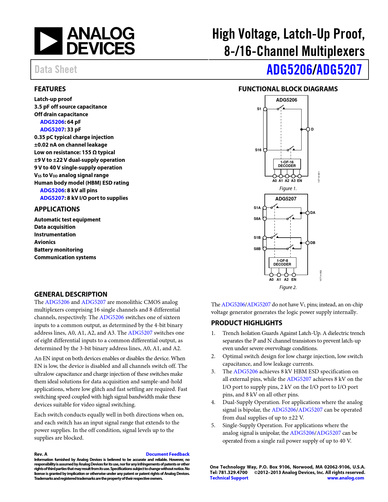 High Voltage, Latch-Up Proof,. 8-/16-Channel Multiplexers. Data Sheet. ADG5206/. ADG5207. FEATURES. FUNCTIONAL BLOCK DIAGRAMS