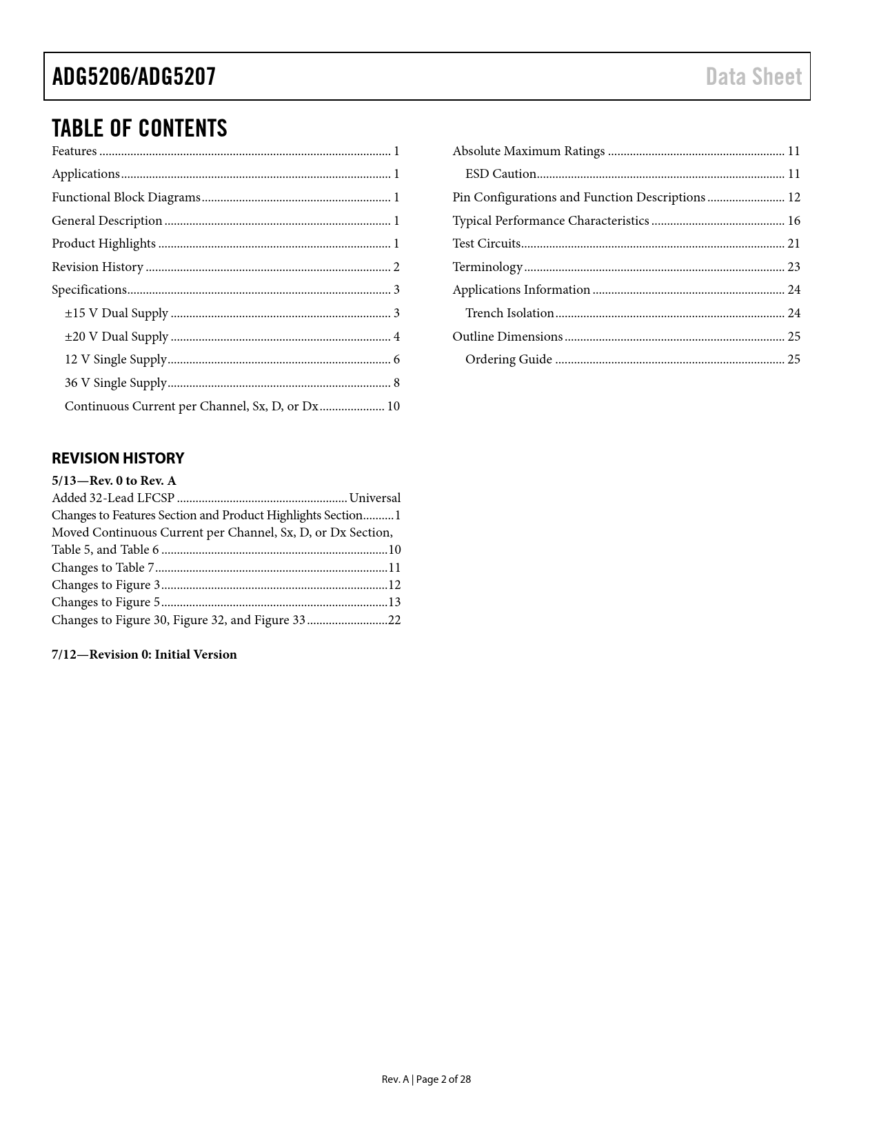 link to page 1 link to page 1 link to page 1 link to page 1 link to page 1 link to page 2 link to page 3 link to page 3 link to page 4 link to page 6 link to page 8 link to page 10 link to page 11 link to page 11 link to page 12 link to page 16 link to page 21 link to page 23 link to page 24 link to page 24 link to page 25 link to page 25 ADG5206/ADG5207Data SheetTABLE OF CONTENTS Features .. 1 Absolute Maximum Ratings ... 11 Applications ... 1 ESD Caution.. 11 Functional Block Diagrams ... 1 Pin Configurations and Function Descriptions ... 12 General Description ... 1 Typical Performance Characteristics ... 16 Product Highlights ... 1 Test Circuits ... 21 Revision History ... 2 Terminology .. 23 Specifications ... 3 Applications Information .. 24 ±15 V Dual Supply ... 3 Trench Isolation .. 24 ±20 V Dual Supply ... 4 Outline Dimensions ... 25 12 V Single Supply .. 6 Ordering Guide .. 25 36 V Single Supply .. 8 Continuous Current per Channel, Sx, D, or Dx ... 10 REVISION HISTORY 5/13—Rev. 0 to Rev. A Added 32-Lead LFCSP ... Universal Changes to Features Section and Product Highlights Section .. 1 Moved Continuous Current per Channel, Sx, D, or Dx Section, Table 5, and Table 6 ... 10 Changes to Table 7 ... 11 Changes to Figure 3 ... 12 Changes to Figure 5 ... 13 Changes to Figure 30, Figure 32, and Figure 33 .. 22 7/12—Revision 0: Initial Version Rev. A | Page 2 of 28 Document Outline Features Applications Functional Block Diagrams General Description Product Highlights Revision History Specifications ±15 V Dual Supply ±20 V Dual Supply 12 V Single Supply 36 V Single Supply Continuous Current per Channel, Sx, D, or Dx Absolute Maximum Ratings ESD Caution Pin Configurations and Function Descriptions Typical Performance Characteristics Test Circuits Terminology Applications Information Trench Isolation Outline Dimensions Ordering Guide