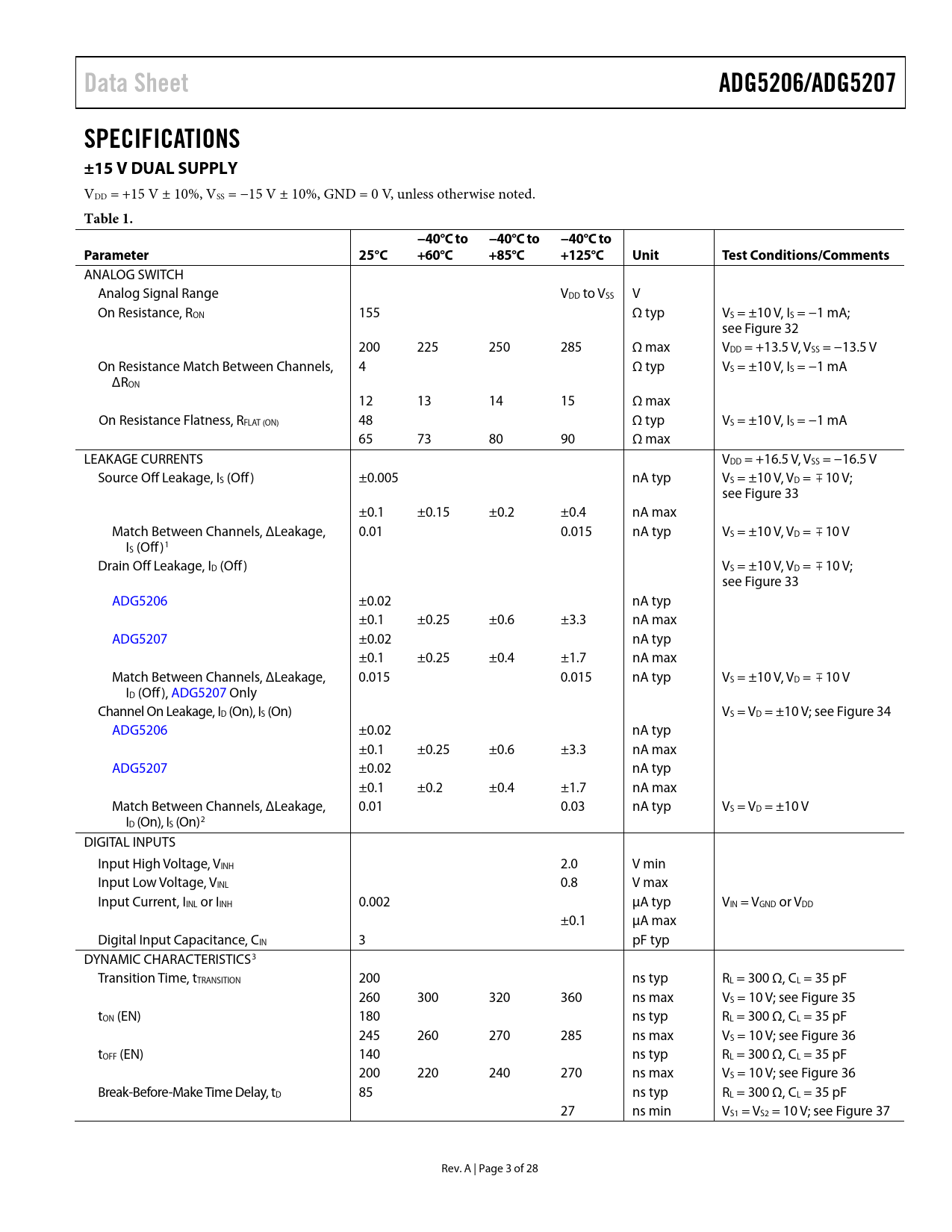 Pages / Page28 / 3 — Data Sheet. ADG5206/ADG5207. SPECIFICATIONS ±15 V DUAL SUPPLY. Table 1. …