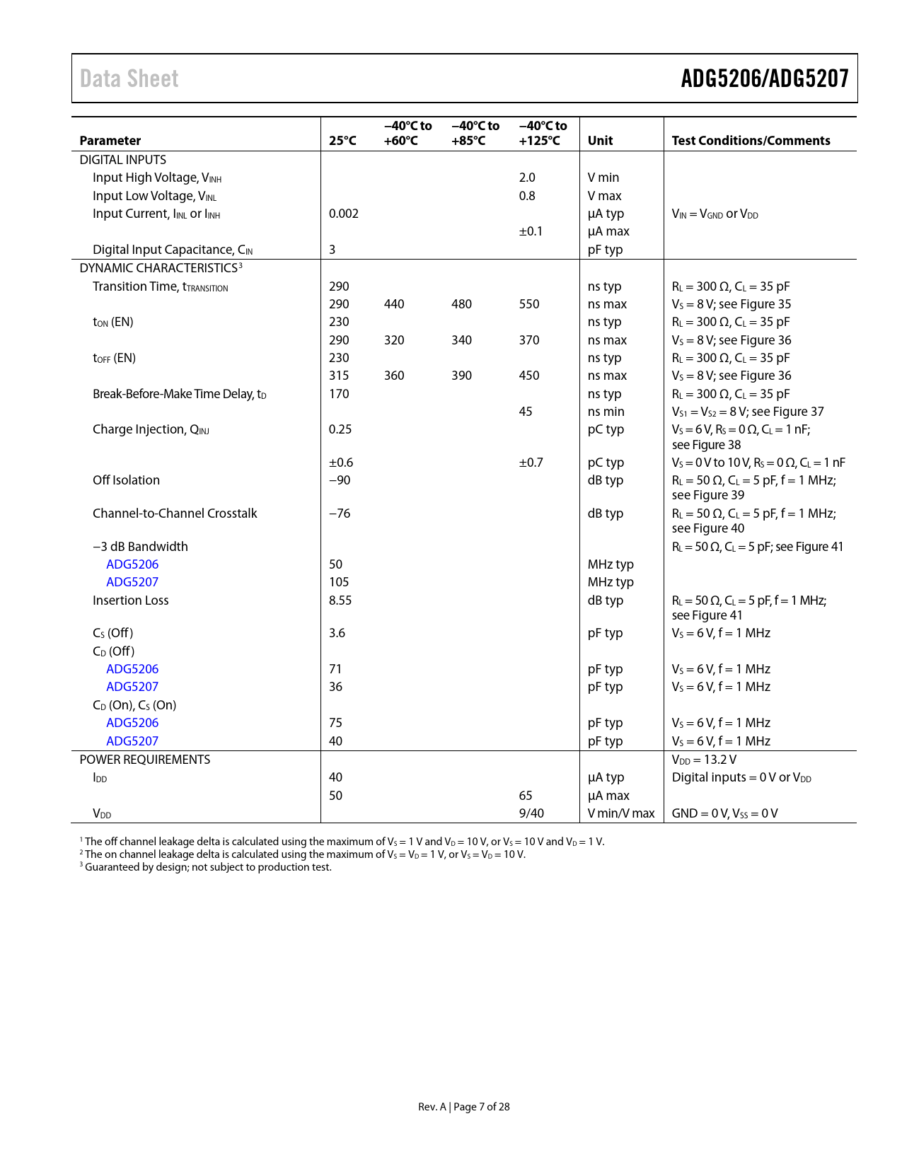 link to page 21 link to page 21 link to page 21 link to page 22 link to page 22 link to page 22 link to page 22 link to page 22 link to page 22 link to page 7 Data SheetADG5206/ADG5207−40°C to−40°C to−40°C toParameter25°C+60°C+85°C+125°CUnitTest Conditions/Comments DIGITAL INPUTS Input High Voltage, VINH 2.0 V min Input Low Voltage, VINL 0.8 V max Input Current, IINL or IINH 0.002 µA typ VIN = VGND or VDD ±0.1 µA max Digital Input Capacitance, CIN 3 pF typ DYNAMIC CHARACTERISTICS3 Transition Time, tTRANSITION 290 ns typ RL = 300 Ω, CL = 35 pF 290 440 480 550 ns max VS = 8 V; see Figure 35 tON (EN) 230 ns typ RL = 300 Ω, CL = 35 pF 290 320 340 370 ns max VS = 8 V; see Figure 36 tOFF (EN) 230 ns typ RL = 300 Ω, CL = 35 pF 315 360 390 450 ns max VS = 8 V; see Figure 36 Break-Before-Make Time Delay, tD 170 ns typ RL = 300 Ω, CL = 35 pF 45 ns min VS1 = VS2 = 8 V; see Figure 37 Charge Injection, QINJ 0.25 pC typ VS = 6 V, RS = 0 Ω, CL = 1 nF; see Figure 38 ±0.6 ±0.7 pC typ VS = 0 V to 10 V, RS = 0 Ω, CL = 1 nF Off Isolation −90 dB typ RL = 50 Ω, CL = 5 pF, f = 1 MHz; see Figure 39 Channel-to-Channel Crosstalk −76 dB typ RL = 50 Ω, CL = 5 pF, f = 1 MHz; see Figure 40 −3 dB Bandwidth RL = 50 Ω, CL = 5 pF; see Figure 41 ADG5206 50 MHz typ ADG5207 105 MHz typ Insertion Loss 8.55 dB typ RL = 50 Ω, CL = 5 pF, f = 1 MHz; see Figure 41 CS (Off) 3.6 pF typ VS = 6 V, f = 1 MHz CD (Off) ADG5206 71 pF typ VS = 6 V, f = 1 MHz ADG5207 36 pF typ VS = 6 V, f = 1 MHz CD (On), CS (On) ADG5206 75 pF typ VS = 6 V, f = 1 MHz ADG5207 40 pF typ VS = 6 V, f = 1 MHz POWER REQUIREMENTS VDD = 13.2 V IDD 40 µA typ Digital inputs = 0 V or VDD 50 65 µA max VDD 9/40 V min/V max GND = 0 V, VSS = 0 V 1 The off channel leakage delta is calculated using the maximum of VS = 1 V and VD = 10 V, or VS = 10 V and VD = 1 V. 2 The on channel leakage delta is calculated using the maximum of VS = VD = 1 V, or VS = VD = 10 V. 3 Guaranteed by design; not subject to production test. Rev. A | Page 7 of 28 Document Outline Features Applications Functional Block Diagrams General Description Product Highlights Revision History Specifications ±15 V Dual Supply ±20 V Dual Supply 12 V Single Supply 36 V Single Supply Continuous Current per Channel, Sx, D, or Dx Absolute Maximum Ratings ESD Caution Pin Configurations and Function Descriptions Typical Performance Characteristics Test Circuits Terminology Applications Information Trench Isolation Outline Dimensions Ordering Guide