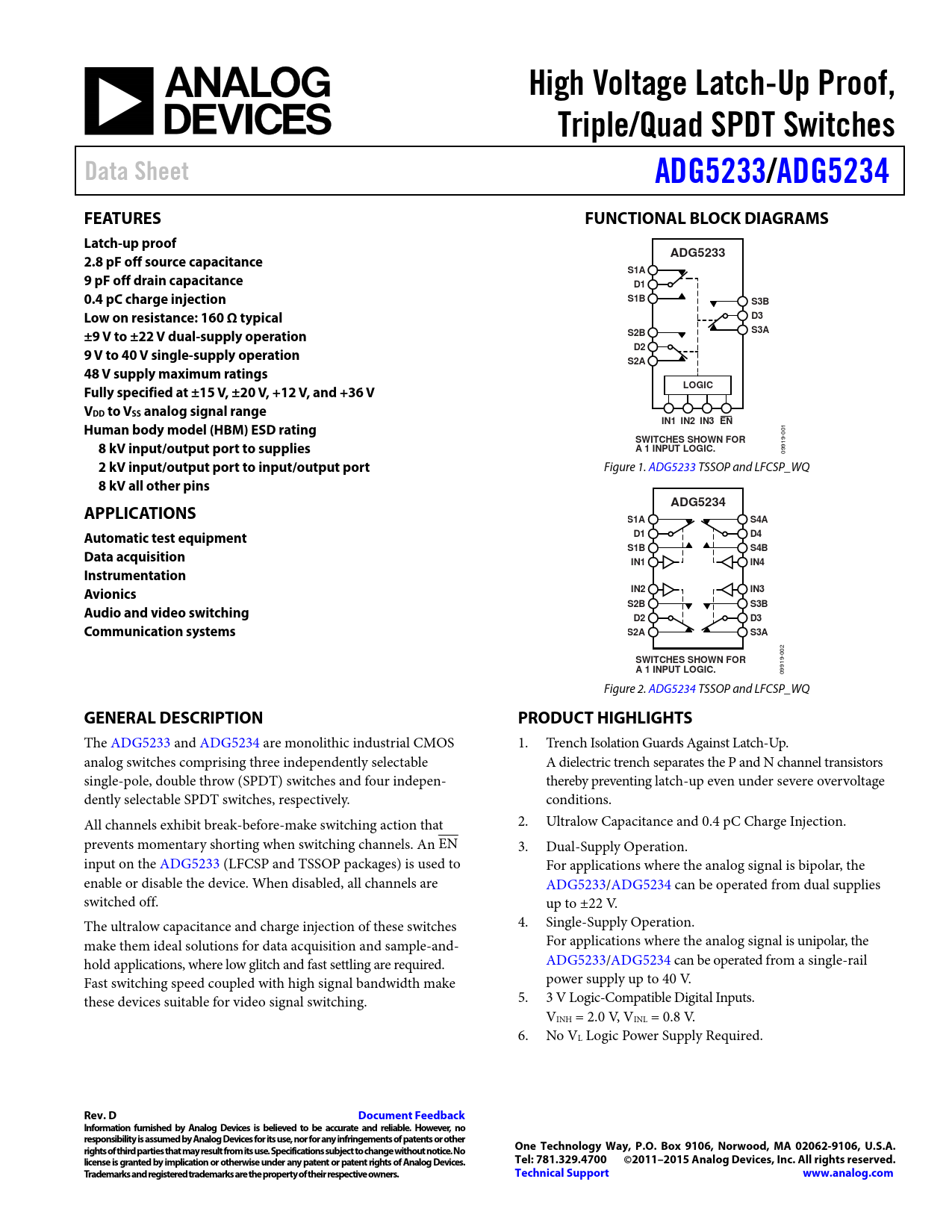 High Voltage Latch-Up Proof,. Triple/Quad SPDT Switches. Data Sheet. ADG5233/. ADG5234. FEATURES. FUNCTIONAL BLOCK DIAGRAMS