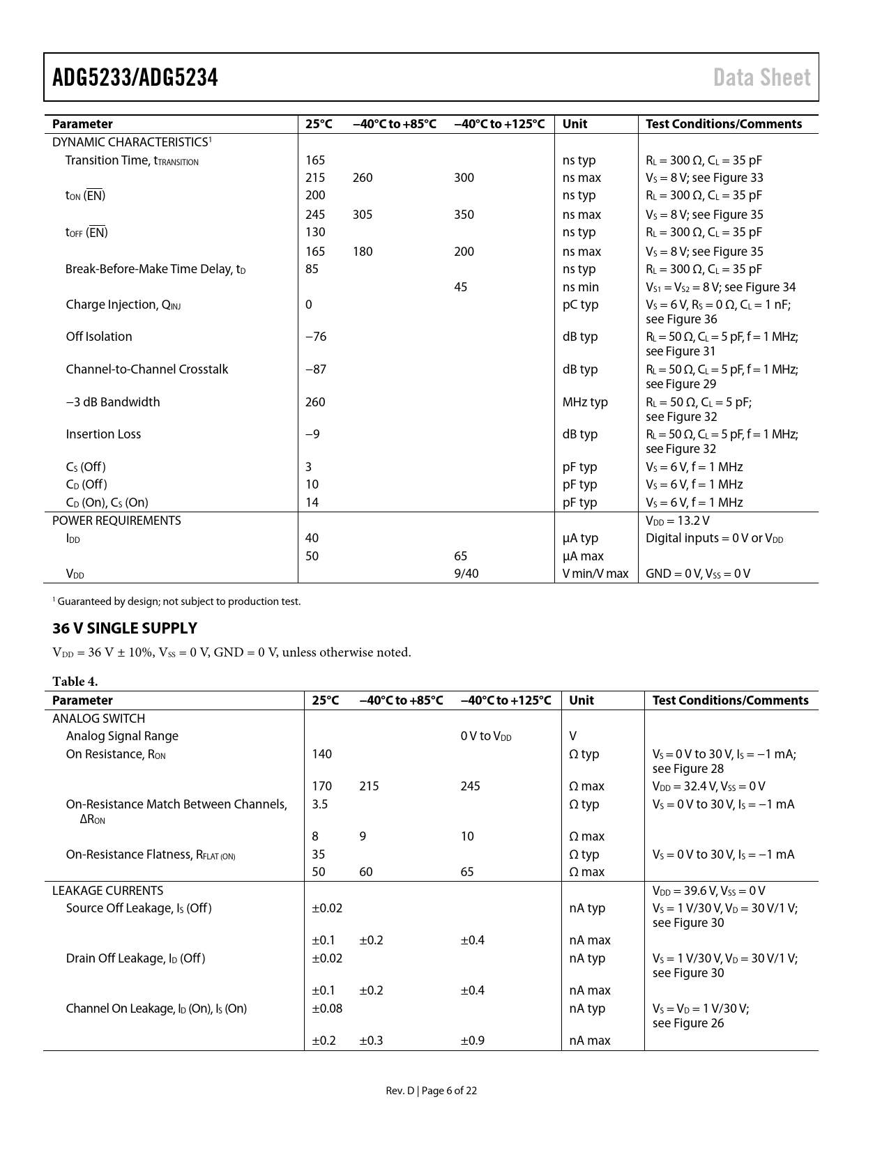 ADG5233/ADG5234. Data Sheet. Parameter. 25°C. −40°C to +85°C. −40°C to +125°C. Unit. Test Conditions/Comments. 36 V SINGLE SUPPLY