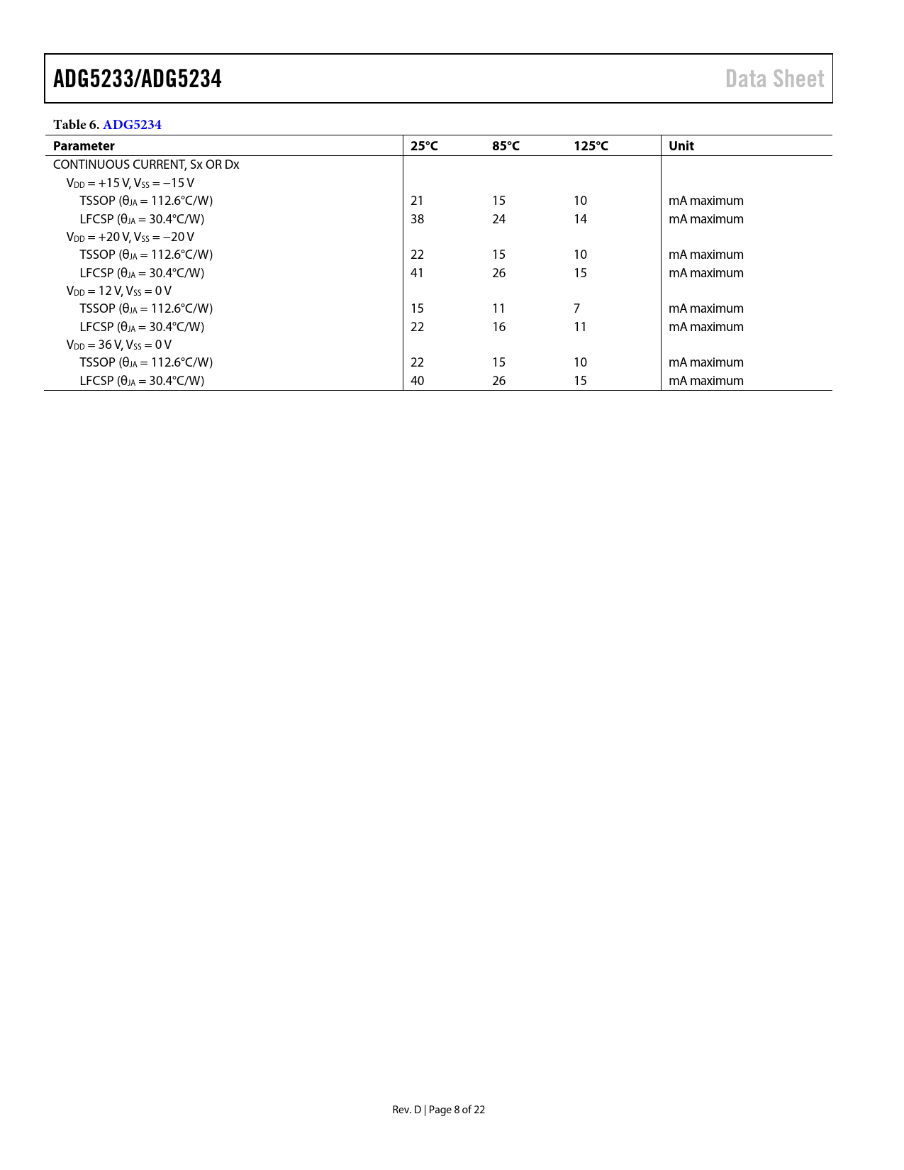 Pages / Page22 / 8 — ADG5233/ADG5234. Data Sheet. Table 6. ADG5234. Parameter. 25°C. 85°C. …