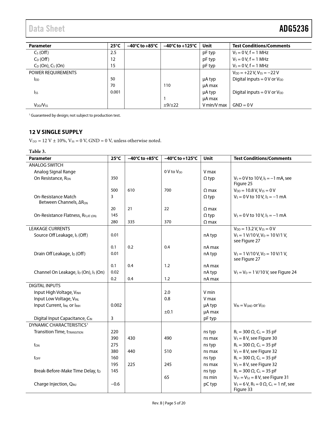 Data Sheet ADG5236 Parameter 25°C −40°C to +85°C −40°C to +125°C Unit Test Conditions/Comments 12 V SINGLE SUPPLY