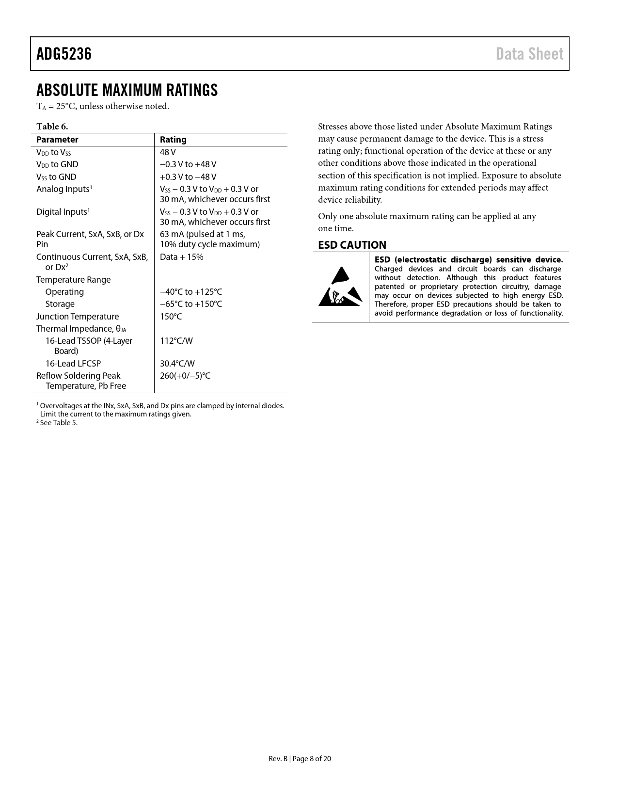 Pages / Page20 / 8 — ADG5236. Data Sheet. ABSOLUTE MAXIMUM RATINGS. Table 6. Parameter. …