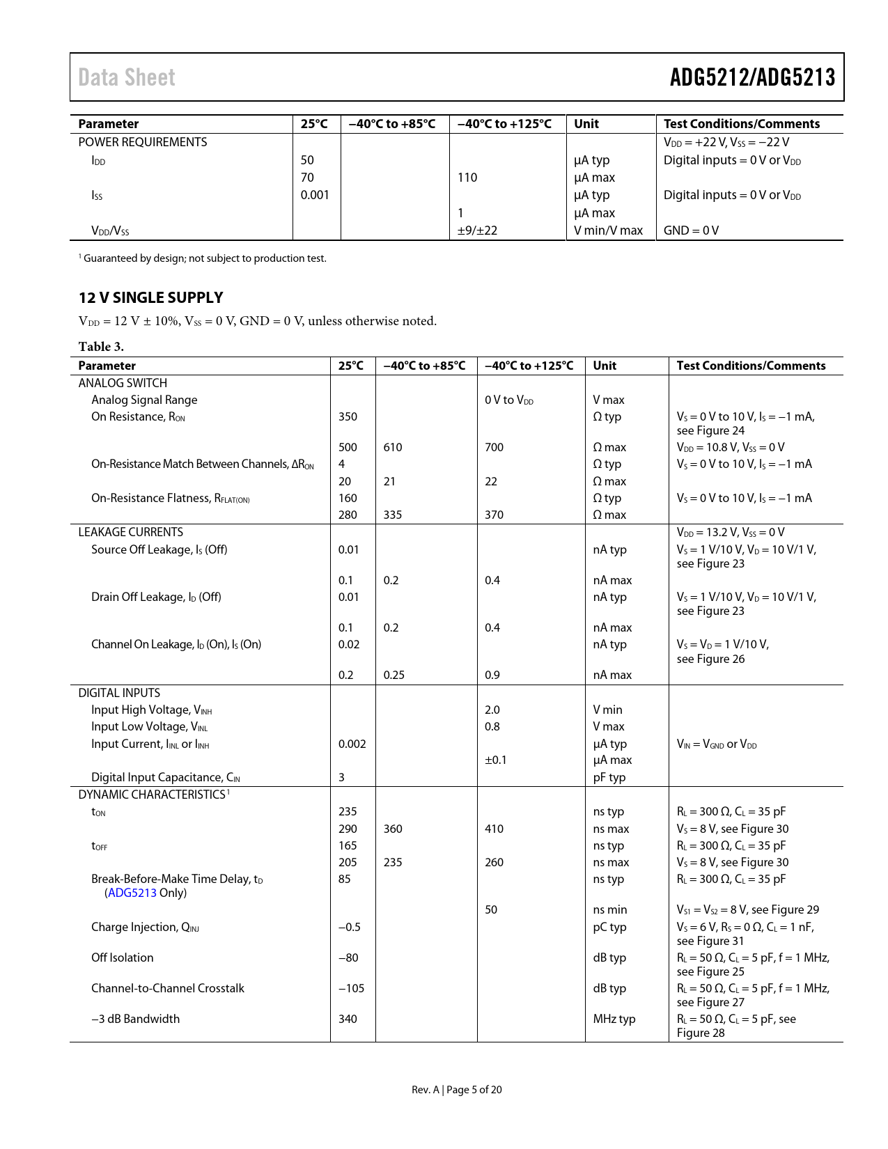 Pages / Page20 / 5 — Data Sheet. ADG5212/ADG5213. Parameter. 25°C. −40°C to +85°C. −40°C to …