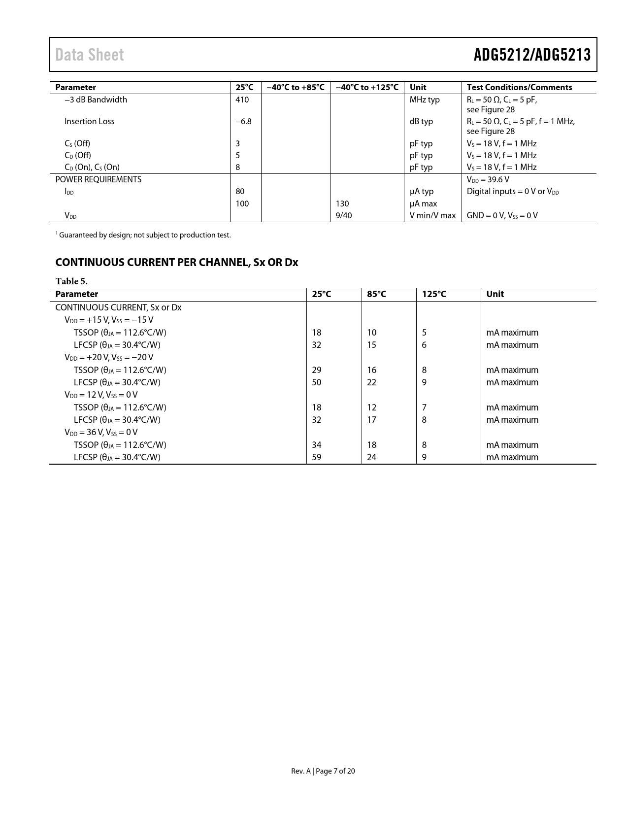Pages / Page20 / 7 — Data Sheet. ADG5212/ADG5213. Parameter. 25°C. −40°C to +85°C −40°C to …