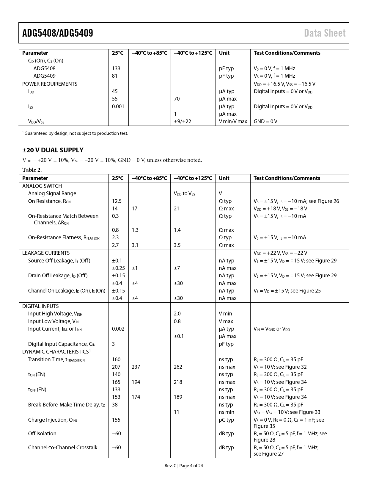 ADG5408/ADG5409. Data Sheet. Parameter. 25°C −40°C to +85°C −40°C to +125°C Unit. Test Conditions/Comments. ±20 V DUAL SUPPLY