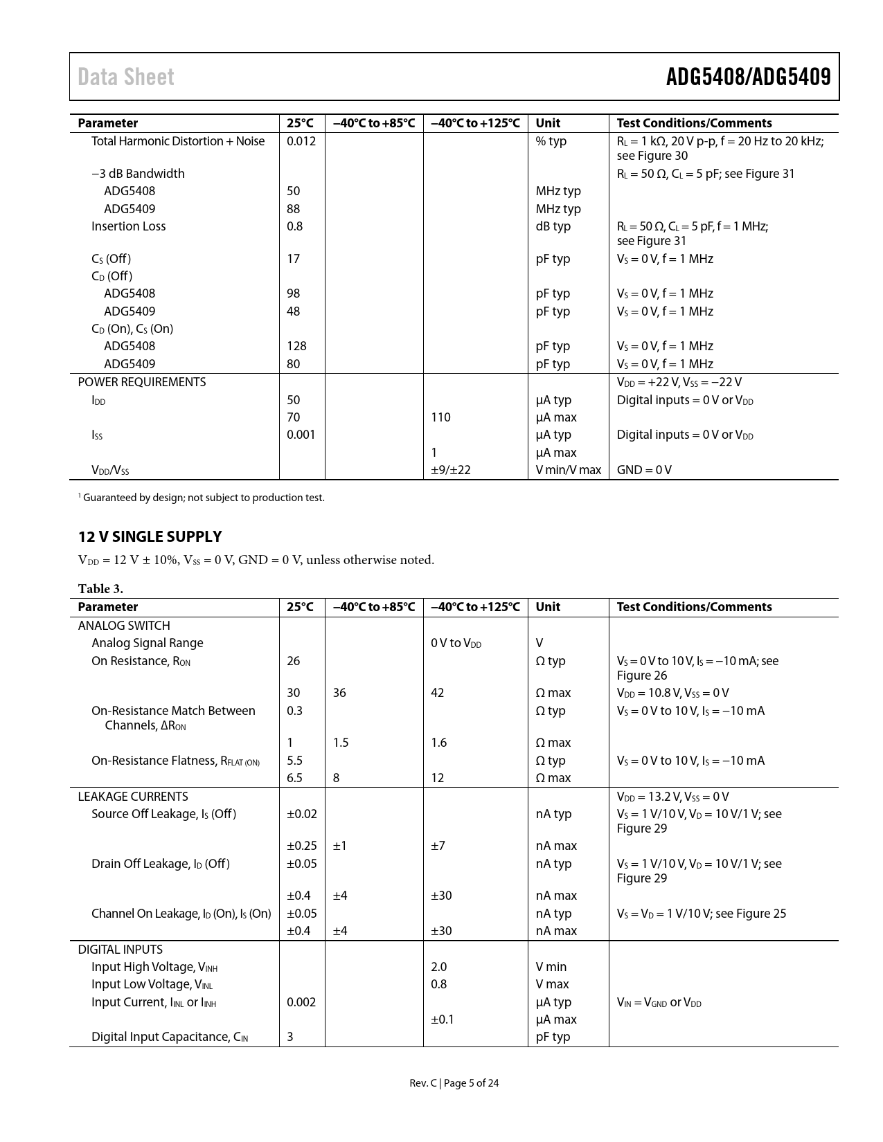 Data Sheet ADG5408/ADG5409 Parameter 25°C −40°C to +85°C −40°C to +125°C Unit Test Conditions/Comments 12 V SINGLE SUPPLY