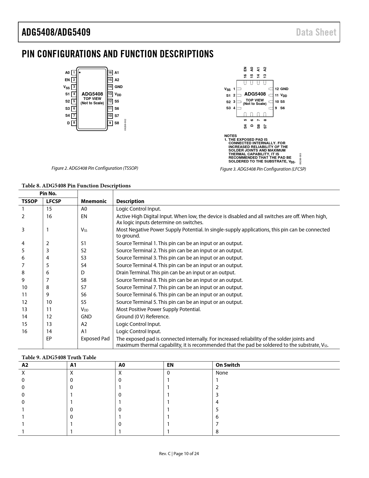 ADG5408/ADG5409Data SheetPIN CONFIGURATIONS AND FUNCTION DESCRIPTIONSN012EAAAA0116 A165431111EN215A2V314SSGNDV1SS12 GNDS1413ADG5408VDDS1 2ADG540811 VDDTOP VIEWS2512S5TOP VIEW(Not to Scale)S2 310 S5(Not to Scale)S3611S6S3 49S6S4710S7 2 56788D9S8 00 6- 4D87 20 SSS 09 NOTES 1. THE EXPOSED PAD IS CONNECTED INTERNALLY. FOR INCREASED RELIABILITY OF THE SOLDER JOINTS AND MAXIMUM THERMAL CAPABILITY, IT IS RECOMMENDED THAT THE PAD BE -003 SOLDERED TO THE SUBSTRATE, VSS. 206 09 Figure 2. ADG5408 Pin Configuration (TSSOP) Figure 3. ADG5408 Pin Configuration (LFCSP) Table 8. ADG5408 Pin Function DescriptionsPin No.TSSOP LFCSPMnemonic Description 1 15 A0 Logic Control Input. 2 16 EN Active High Digital Input. When low, the device is disabled and all switches are off. When high, Ax logic inputs determine on switches. 3 1 VSS Most Negative Power Supply Potential. In single-supply applications, this pin can be connected to ground. 4 2 S1 Source Terminal 1. This pin can be an input or an output. 5 3 S2 Source Terminal 2. This pin can be an input or an output. 6 4 S3 Source Terminal 3. This pin can be an input or an output. 7 5 S4 Source Terminal 4. This pin can be an input or an output. 8 6 D Drain Terminal. This pin can be an input or an output. 9 7 S8 Source Terminal 8. This pin can be an input or an output. 10 8 S7 Source Terminal 7. This pin can be an input or an output. 11 9 S6 Source Terminal 6. This pin can be an input or an output. 12 10 S5 Source Terminal 5. This pin can be an input or an output. 13 11 VDD Most Positive Power Supply Potential. 14 12 GND Ground (0 V) Reference. 15 13 A2 Logic Control Input. 16 14 A1 Logic Control Input. EP Exposed Pad The exposed pad is connected internally. For increased reliability of the solder joints and maximum thermal capability, it is recommended that the pad be soldered to the substrate, VSS. Table 9. ADG5408 Truth Table A2A1A0ENOn Switch X X X 0 None 0 0 0 1 1 0 0 1 1 2 0 1 0 1 3 0 1 1 1 4 1 0 0 1 5 1 0 1 1 6 1 1 0 1 7 1 1 1 1 8 Rev. C | Page 10 of 24 Document Outline Features Applications Functional Block Diagrams General Description Product Highlights Revision History Specifications ±15 V Dual Supply ±20 V Dual Supply 12 V Single Supply 36 V Single Supply Continuous Current per Channel, Sx or D Absolute Maximum Ratings ESD Caution Pin Configurations and Function Descriptions Typical Performance Characteristics Test Circuits Terminology Trench Isolation Applications Information Outline Dimensions Ordering Guide