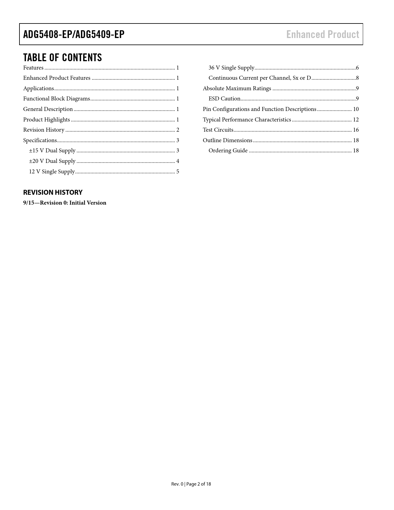 Pages / Page18 / 2 — ADG5408-EP/ADG5409-EP. Enhanced Product. TABLE OF CONTENTS. REVISION …