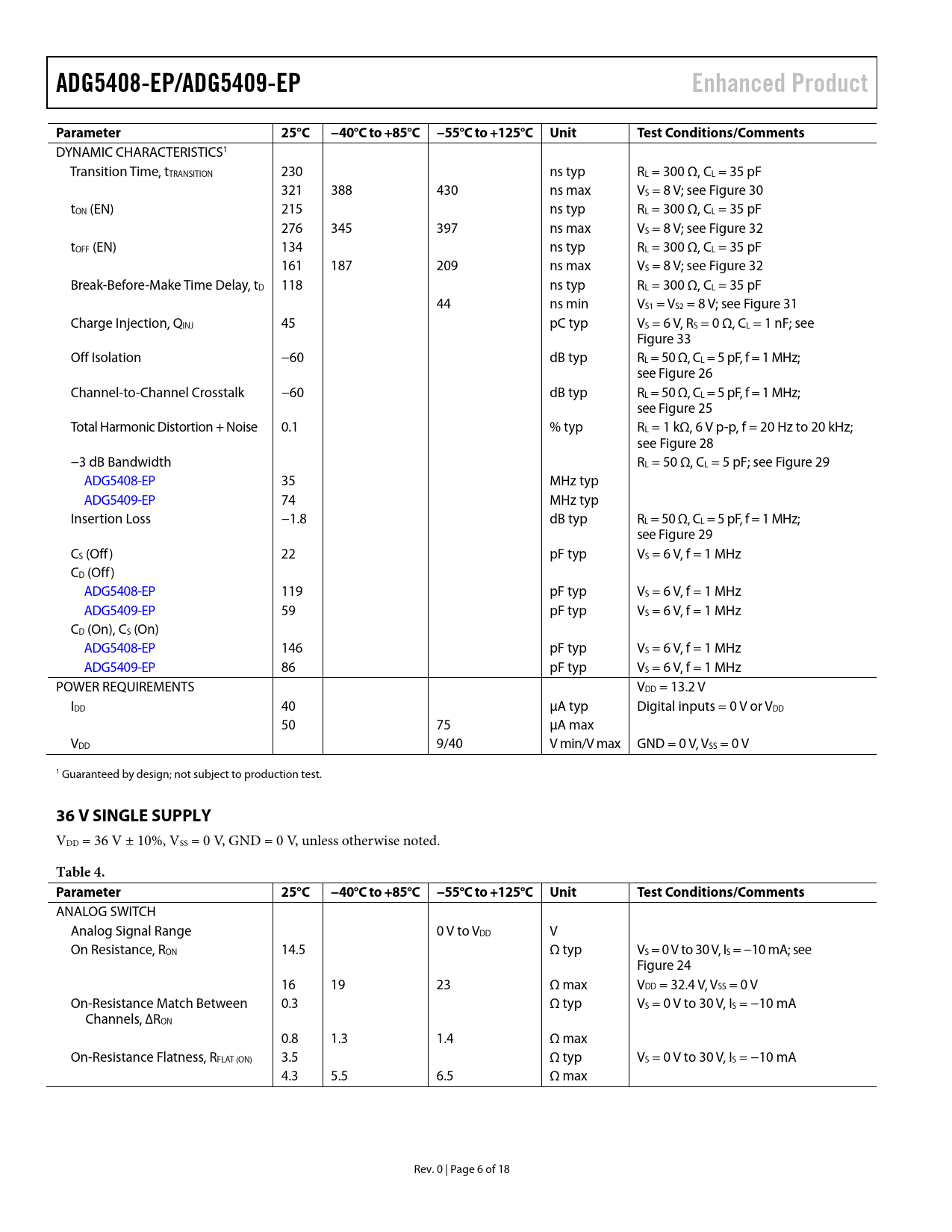 link to page 17 link to page 17 link to page 17 link to page 17 link to page 17 link to page 16 link to page 16 link to page 16 link to page 16 link to page 16 link to page 16 ADG5408-EP/ADG5409-EPEnhanced ProductParameter25°C−40°C to +85°C−55°C to +125°CUnitTest Conditions/Comments DYNAMIC CHARACTERISTICS1 Transition Time, tTRANSITION 230 ns typ RL = 300 Ω, CL = 35 pF 321 388 430 ns max VS = 8 V; see Figure 30 tON (EN) 215 ns typ RL = 300 Ω, CL = 35 pF 276 345 397 ns max VS = 8 V; see Figure 32 tOFF (EN) 134 ns typ RL = 300 Ω, CL = 35 pF 161 187 209 ns max VS = 8 V; see Figure 32 Break-Before-Make Time Delay, tD 118 ns typ RL = 300 Ω, CL = 35 pF 44 ns min VS1 = VS2 = 8 V; see Figure 31 Charge Injection, QINJ 45 pC typ VS = 6 V, RS = 0 Ω, CL = 1 nF; see Figure 33 Off Isolation −60 dB typ RL = 50 Ω, CL = 5 pF, f = 1 MHz; see Figure 26 Channel-to-Channel Crosstalk −60 dB typ RL = 50 Ω, CL = 5 pF, f = 1 MHz; see Figure 25 Total Harmonic Distortion + Noise 0.1 % typ RL = 1 kΩ, 6 V p-p, f = 20 Hz to 20 kHz; see Figure 28 −3 dB Bandwidth RL = 50 Ω, CL = 5 pF; see Figure 29 ADG5408-EP 35 MHz typ ADG5409-EP 74 MHz typ Insertion Loss −1.8 dB typ RL = 50 Ω, CL = 5 pF, f = 1 MHz; see Figure 29 CS (Off ) 22 pF typ VS = 6 V, f = 1 MHz CD (Off ) ADG5408-EP 119 pF typ VS = 6 V, f = 1 MHz ADG5409-EP 59 pF typ VS = 6 V, f = 1 MHz CD (On), CS (On) ADG5408-EP 146 pF typ VS = 6 V, f = 1 MHz ADG5409-EP 86 pF typ VS = 6 V, f = 1 MHz POWER REQUIREMENTS VDD = 13.2 V IDD 40 μA typ Digital inputs = 0 V or VDD 50 75 μA max VDD 9/40 V min/V max GND = 0 V, VSS = 0 V 1 Guaranteed by design; not subject to production test. 36 V SINGLE SUPPLY VDD = 36 V ± 10%, VSS = 0 V, GND = 0 V, unless otherwise noted. Table 4. Parameter25°C−40°C to +85°C−55°C to +125°CUnitTest Conditions/Comments ANALOG SWITCH Analog Signal Range 0 V to VDD V On Resistance, RON 14.5 Ω typ VS = 0 V to 30 V, IS = −10 mA; see Figure 24 16 19 23 Ω max VDD = 32.4 V, VSS = 0 V On-Resistance Match Between 0.3 Ω typ VS = 0 V to 30 V, IS = −10 mA Channels, ∆RON 0.8 1.3 1.4 Ω max On-Resistance Flatness, RFLAT (ON) 3.5 Ω typ VS = 0 V to 30 V, IS = −10 mA 4.3 5.5 6.5 Ω max Rev. 0 | Page 6 of 18 Document Outline FEATURES ENHANCED PRODUCT FEATURES APPLICATIONS FUNCTIONAL BLOCK DIAGRAMS GENERAL DESCRIPTION PRODUCT HIGHLIGHTS TABLE OF CONTENTS REVISION HISTORY SPECIFICATIONS ±15 V DUAL SUPPLY ±20 V DUAL SUPPLY 12 V SINGLE SUPPLY 36 V SINGLE SUPPLY CONTINUOUS CURRENT PER CHANNEL, Sx OR D ABSOLUTE MAXIMUM RATINGS ESD CAUTION PIN CONFIGURATIONS AND FUNCTION DESCRIPTIONS TYPICAL PERFORMANCE CHARACTERISTICS TEST CIRCUITS OUTLINE DIMENSIONS ORDERING GUIDE