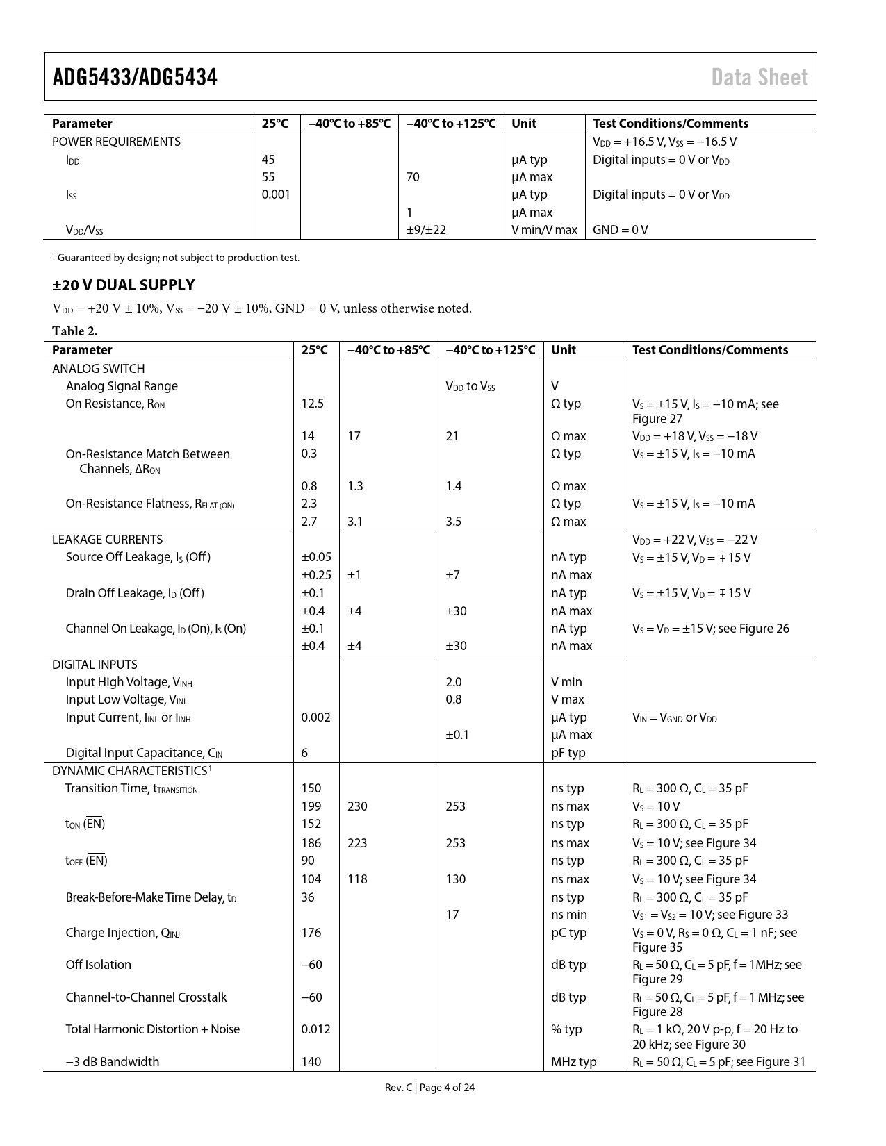 ADG5433/ADG5434. Data Sheet. Parameter. 25°C −40°C to +85°C −40°C to +125°C Unit. Test Conditions/Comments. ±20 V DUAL SUPPLY