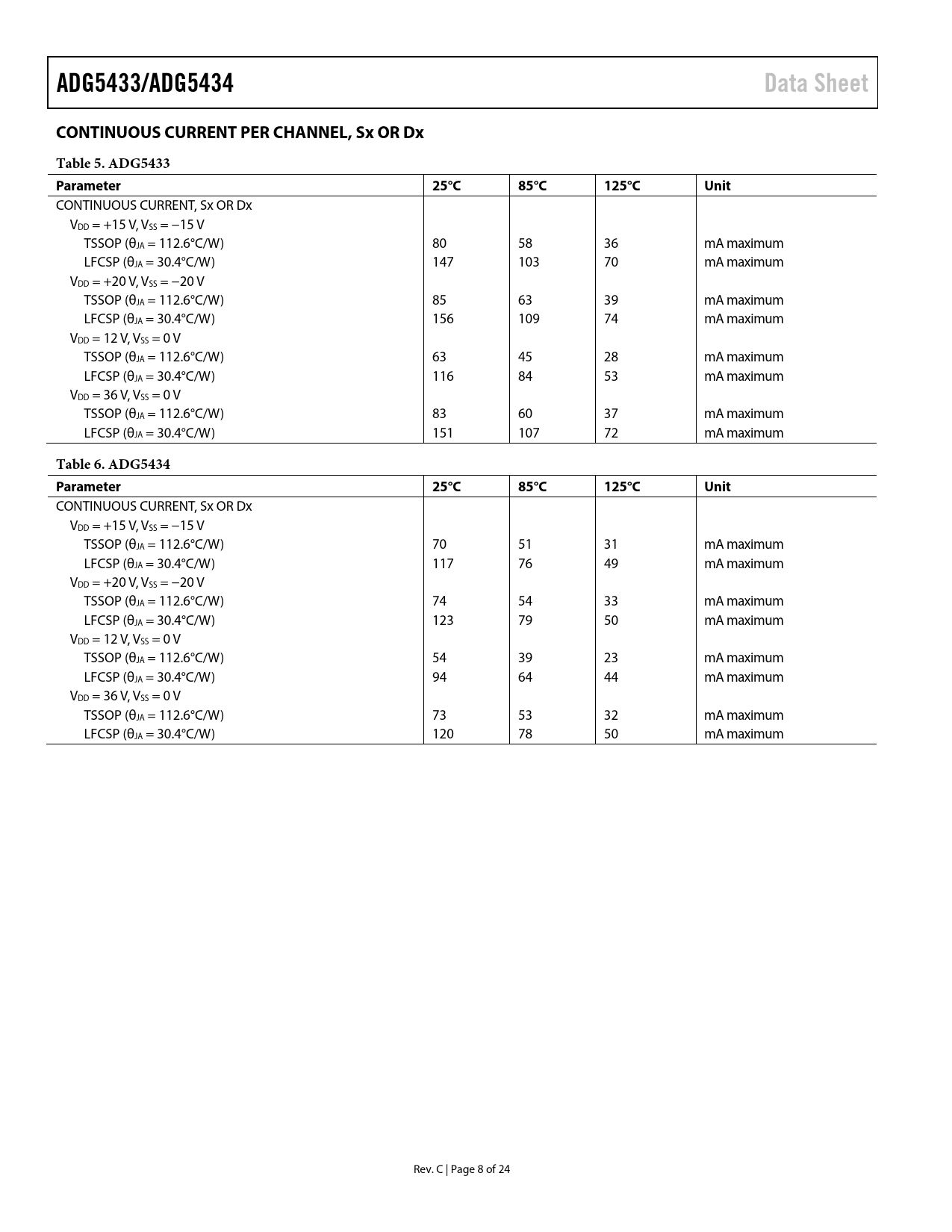 ADG5433/ADG5434Data SheetCONTINUOUS CURRENT PER CHANNEL, Sx OR DxTable 5. ADG5433 Parameter25°C85°C125°CUnit CONTINUOUS CURRENT, Sx OR Dx VDD = +15 V, VSS = −15 V TSSOP (θJA = 112.6°C/W) 80 58 36 mA maximum LFCSP (θJA = 30.4°C/W) 147 103 70 mA maximum VDD = +20 V, VSS = −20 V TSSOP (θJA = 112.6°C/W) 85 63 39 mA maximum LFCSP (θJA = 30.4°C/W) 156 109 74 mA maximum VDD = 12 V, VSS = 0 V TSSOP (θJA = 112.6°C/W) 63 45 28 mA maximum LFCSP (θJA = 30.4°C/W) 116 84 53 mA maximum VDD = 36 V, VSS = 0 V TSSOP (θJA = 112.6°C/W) 83 60 37 mA maximum LFCSP (θJA = 30.4°C/W) 151 107 72 mA maximum Table 6. ADG5434 Parameter25°C85°C125°CUnit CONTINUOUS CURRENT, Sx OR Dx VDD = +15 V, VSS = −15 V TSSOP (θJA = 112.6°C/W) 70 51 31 mA maximum LFCSP (θJA = 30.4°C/W) 117 76 49 mA maximum VDD = +20 V, VSS = −20 V TSSOP (θJA = 112.6°C/W) 74 54 33 mA maximum LFCSP (θJA = 30.4°C/W) 123 79 50 mA maximum VDD = 12 V, VSS = 0 V TSSOP (θJA = 112.6°C/W) 54 39 23 mA maximum LFCSP (θJA = 30.4°C/W) 94 64 44 mA maximum VDD = 36 V, VSS = 0 V TSSOP (θJA = 112.6°C/W) 73 53 32 mA maximum LFCSP (θJA = 30.4°C/W) 120 78 50 mA maximum Rev. C | Page 8 of 24 Document Outline Features Applications Functional Block Diagrams General Description Product Highlights Revision History Specifications ±15 V Dual Supply ±20 V Dual Supply 12 V Single Supply 36 V Single Supply Continuous Current per Channel, Sx or Dx Absolute Maximum Ratings ESD Caution Pin Configurations and Function Descriptions Typical Performance Characteristics Test Circuits Terminology Trench Isolation Applications Information Outline Dimensions Ordering Guide