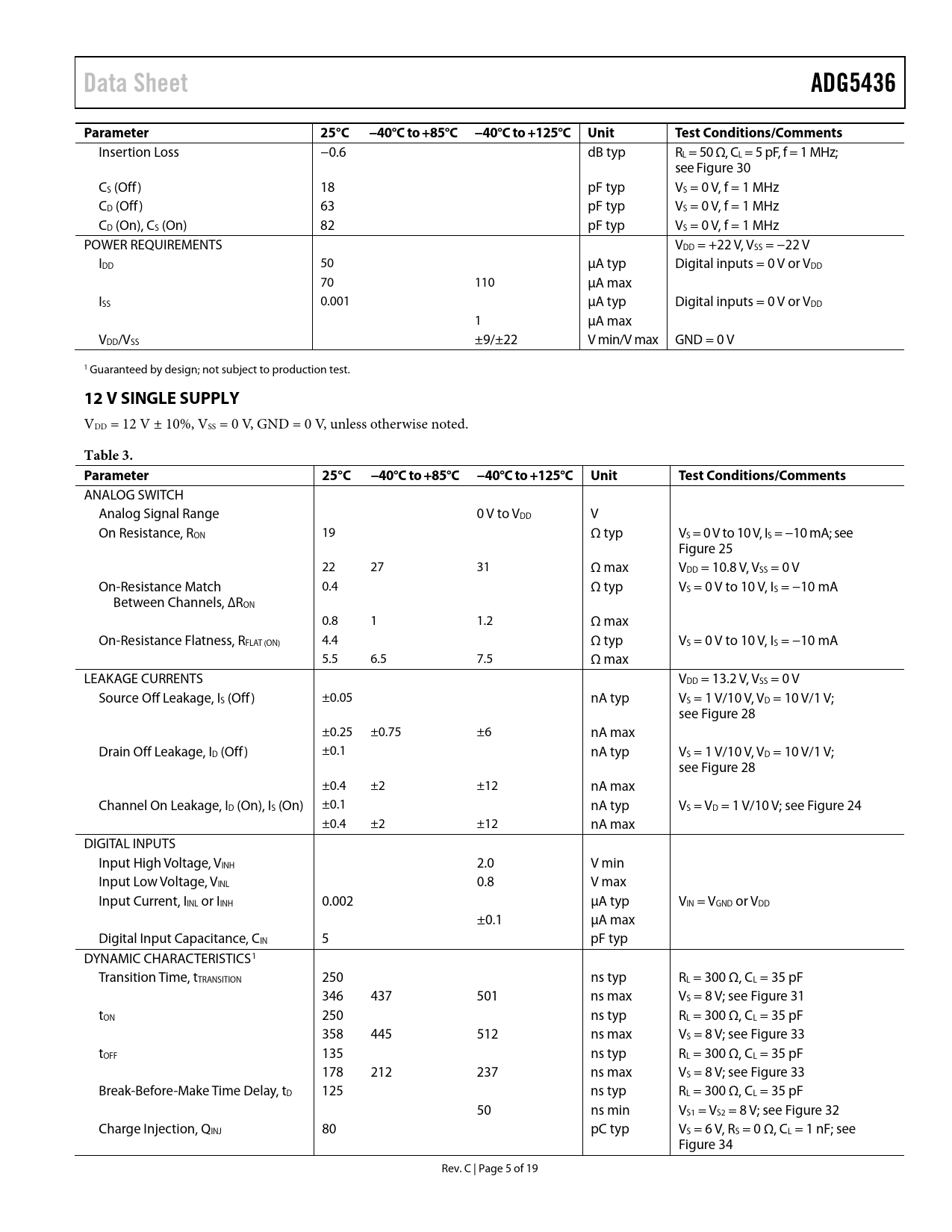 link to page 14 link to page 14 link to page 14 link to page 14 link to page 14 link to page 15 link to page 15 link to page 15 link to page 15 link to page 15 link to page 6 Data SheetADG5436Parameter25°C −40°C to +85°C −40°C to +125°C UnitTest Conditions/Comments Insertion Loss −0.6 dB typ RL = 50 Ω, CL = 5 pF, f = 1 MHz; see Figure 30 CS (Off) 18 pF typ VS = 0 V, f = 1 MHz CD (Off) 63 pF typ VS = 0 V, f = 1 MHz CD (On), CS (On) 82 pF typ VS = 0 V, f = 1 MHz POWER REQUIREMENTS VDD = +22 V, VSS = −22 V IDD 50 µA typ Digital inputs = 0 V or VDD 70 110 µA max ISS 0.001 µA typ Digital inputs = 0 V or VDD 1 µA max VDD/VSS ±9/±22 V min/V max GND = 0 V 1 Guaranteed by design; not subject to production test. 12 V SINGLE SUPPLY VDD = 12 V ± 10%, VSS = 0 V, GND = 0 V, unless otherwise noted. Table 3. Parameter25°C−40°C to +85°C −40°C to +125°C UnitTest Conditions/Comments ANALOG SWITCH Analog Signal Range 0 V to VDD V On Resistance, RON 19 Ω typ VS = 0 V to 10 V, IS = −10 mA; see Figure 25 22 27 31 Ω max VDD = 10.8 V, VSS = 0 V On-Resistance Match 0.4 Ω typ VS = 0 V to 10 V, IS = −10 mA Between Channels, ∆RON 0.8 1 1.2 Ω max On-Resistance Flatness, RFLAT (ON) 4.4 Ω typ VS = 0 V to 10 V, IS = −10 mA 5.5 6.5 7.5 Ω max LEAKAGE CURRENTS VDD = 13.2 V, VSS = 0 V Source Off Leakage, IS (Off) ±0.05 nA typ VS = 1 V/10 V, VD = 10 V/1 V; see Figure 28 ±0.25 ±0.75 ±6 nA max Drain Off Leakage, ID (Off) ±0.1 nA typ VS = 1 V/10 V, VD = 10 V/1 V; see Figure 28 ±0.4 ±2 ±12 nA max Channel On Leakage, ID (On), IS (On) ±0.1 nA typ VS = VD = 1 V/10 V; see Figure 24 ±0.4 ±2 ±12 nA max DIGITAL INPUTS Input High Voltage, VINH 2.0 V min Input Low Voltage, VINL 0.8 V max Input Current, IINL or IINH 0.002 µA typ VIN = VGND or VDD ±0.1 µA max Digital Input Capacitance, CIN 5 pF typ DYNAMIC CHARACTERISTICS1 Transition Time, tTRANSITION 250 ns typ RL = 300 Ω, CL = 35 pF 346 437 501 ns max VS = 8 V; see Figure 31 tON 250 ns typ RL = 300 Ω, CL = 35 pF 358 445 512 ns max VS = 8 V; see Figure 33 tOFF 135 ns typ RL = 300 Ω, CL = 35 pF 178 212 237 ns max VS = 8 V; see Figure 33 Break-Before-Make Time Delay, tD 125 ns typ RL = 300 Ω, CL = 35 pF 50 ns min VS1 = VS2 = 8 V; see Figure 32 Charge Injection, QINJ 80 pC typ VS = 6 V, RS = 0 Ω, CL = 1 nF; see Figure 34 Rev. C | Page 5 of 19 Document Outline FEATURES APPLICATIONS FUNCTIONAL BLOCK DIAGRAMS GENERAL DESCRIPTION PRODUCT HIGHLIGHTS REVISION HISTORY SPECIFICATIONS ±15 V DUAL SUPPLY ±20 V DUAL SUPPLY 12 V SINGLE SUPPLY 36 V SINGLE SUPPLY CONTINUOUS CURRENT PER CHANNEL, Sx OR Dx ABSOLUTE MAXIMUM RATINGS ESD CAUTION PIN CONFIGURATIONS AND FUNCTION DESCRIPTIONS TRUTH TABLE FOR SWITCHES TYPICAL PERFORMANCE CHARACTERISTICS TEST CIRCUITS TERMINOLOGY TRENCH ISOLATION APPLICATIONS INFORMATION OUTLINE DIMENSIONS ORDERING GUIDE