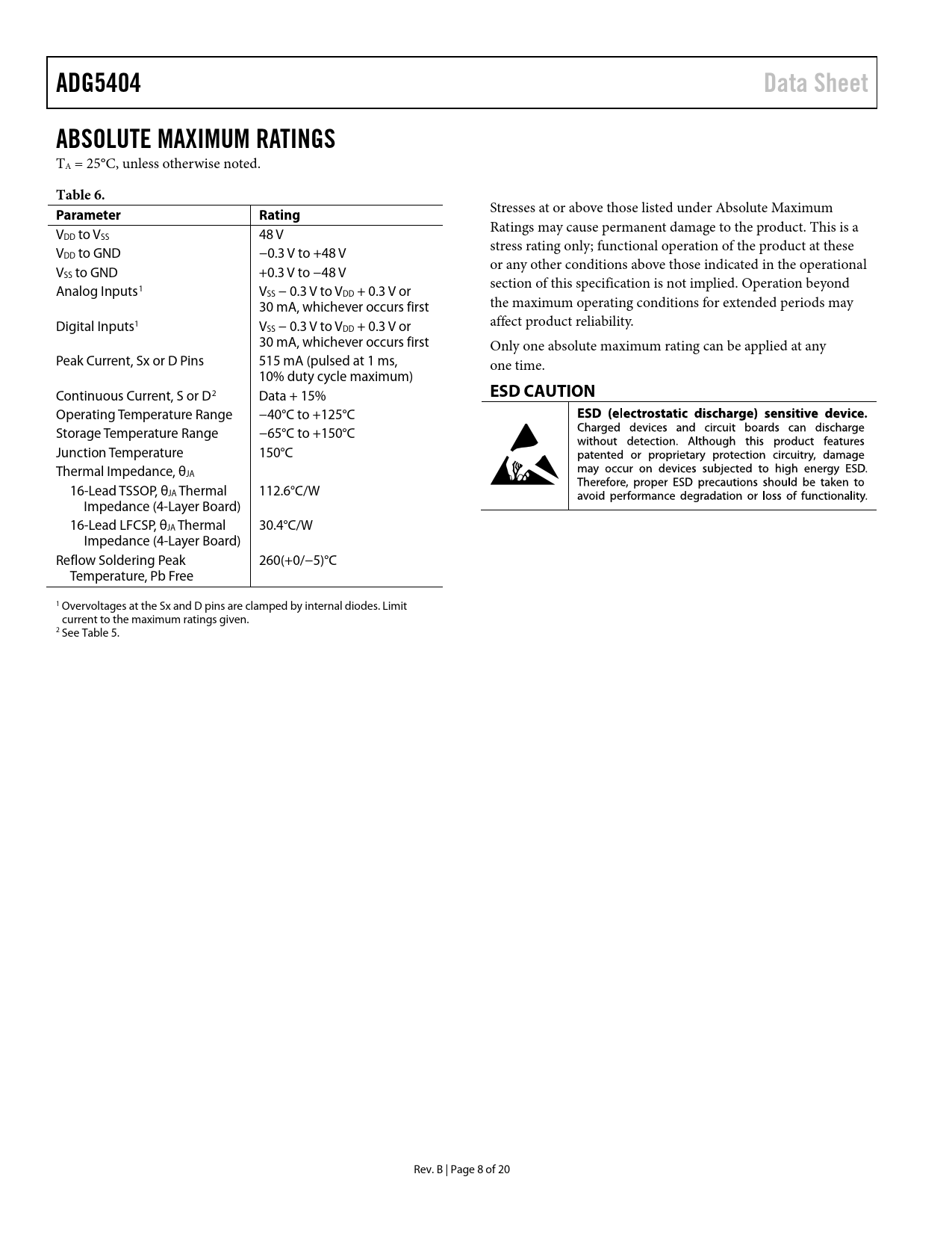 Pages / Page20 / 8 — ADG5404. Data Sheet. ABSOLUTE MAXIMUM RATINGS. Table 6. Parameter. …