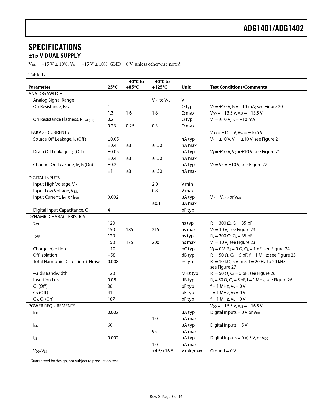 link to page 12 link to page 12 link to page 12 link to page 12 link to page 3 link to page 12 link to page 12 link to page 12 link to page 13 link to page 13 link to page 13 link to page 13 ADG1401/ADG1402SPECIFICATIONS ±15 V DUAL SUPPLY VDD = +15 V ± 10%, VSS = −15 V ± 10%, GND = 0 V, unless otherwise noted. Table 1.−40°C to−40°C toParameter 25°C+85°C+125°C UnitTestConditions/Comments ANALOG SWITCH Analog Signal Range VDD to VSS V On Resistance, RON 1 Ω typ VS = ±10 V, IS = −10 mA; see Figure 20 1.3 1.6 1.8 Ω max VDD = +13.5 V, VSS = −13.5 V On Resistance Flatness, RFLAT (ON) 0.2 Ω typ VS = ±10 V; IS = −10 mA 0.23 0.26 0.3 Ω max LEAKAGE CURRENTS VDD = +16.5 V, VSS = −16.5 V Source Off Leakage, IS (Off ) ±0.05 nA typ VS = ±10 V, VD = ±10 V; see Figure 21 ±0.4 ±3 ±150 nA max Drain Off Leakage, ID (Off ) ±0.05 nA typ VS = ±10 V, VD = ±10 V; see Figure 21 ±0.4 ±3 ±150 nA max Channel On Leakage, ID, IS (On) ±0.2 nA typ VS = VD = ±10 V; see Figure 22 ±1 ±3 ±150 nA max DIGITAL INPUTS Input High Voltage, VINH 2.0 V min Input Low Voltage, VINL 0.8 V max Input Current, IINL or IINH 0.002 μA typ VIN = VGND or VDD ±0.1 μA max Digital Input Capacitance, CIN 4 pF typ DYNAMIC CHARACTERISTICS1 tON 120 ns typ RL = 300 Ω, CL = 35 pF 150 185 215 ns max VS = 10 V; see Figure 23 tOFF 120 ns typ RL = 300 Ω, CL = 35 pF 150 175 200 ns max VS = 10 V; see Figure 23 Charge Injection −12 pC typ VS = 0 V, RS = 0 Ω, CL = 1 nF; see Figure 24 Off Isolation −58 dB typ RL = 50 Ω, CL = 5 pF, f = 1 MHz; see Figure 25 Total Harmonic Distortion + Noise 0.008 % typ RL = 10 kΩ, 5 V rms, f = 20 Hz to 20 kHz; see Figure 27 −3 dB Bandwidth 120 MHz typ RL = 50 Ω, CL = 5 pF; see Figure 26 Insertion Loss 0.08 dB typ RL = 50 Ω, CL = 5 pF, f = 1 MHz; see Figure 26 CS (Off ) 36 pF typ f = 1 MHz, VS = 0 V CD (Off ) 41 pF typ f = 1 MHz, VS = 0 V CD, CS (On) 187 pF typ f = 1 MHz, VS = 0 V POWER REQUIREMENTS VDD = +16.5 V, VSS = −16.5 V IDD 0.002 μA typ Digital inputs = 0 V or VDD 1.0 μA max IDD 60 μA typ Digital inputs = 5 V 95 μA max ISS 0.002 μA typ Digital inputs = 0 V, 5 V, or VDD 1.0 μA max VDD/VSS ±4.5/±16.5 V min/max Ground = 0 V 1 Guaranteed by design, not subject to production test. Rev. 0 | Page 3 of 16 Document Outline FEATURES APPLICATIONS GENERAL DESCRIPTION FUNCTIONAL BLOCK DIAGRAM PRODUCT HIGHLIGHTS TABLE OF CONTENTS REVISION HISTORY SPECIFICATIONS ±15 V DUAL SUPPLY +12 V SINGLE SUPPLY ±5 V DUAL SUPPLY CONTINUOUS CURRENT PER CHANNEL, S OR D ABSOLUTE MAXIMUM RATINGS THERMAL RESISTANCE ESD CAUTION PIN CONFIGURATION AND FUNCTION DESCRIPTIONS TYPICAL PERFORMANCE CHARACTERISTICS TEST CIRCUITS TERMINOLOGY OUTLINE DIMENSIONS ORDERING GUIDE