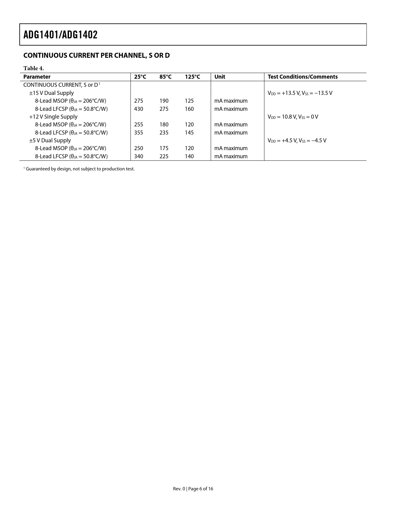ADG1401/ADG1402. CONTINUOUS CURRENT PER CHANNEL, S OR D. Table 4. Parameter. 25°C 85°C 125°C Unit. Test. Conditions/Comments
