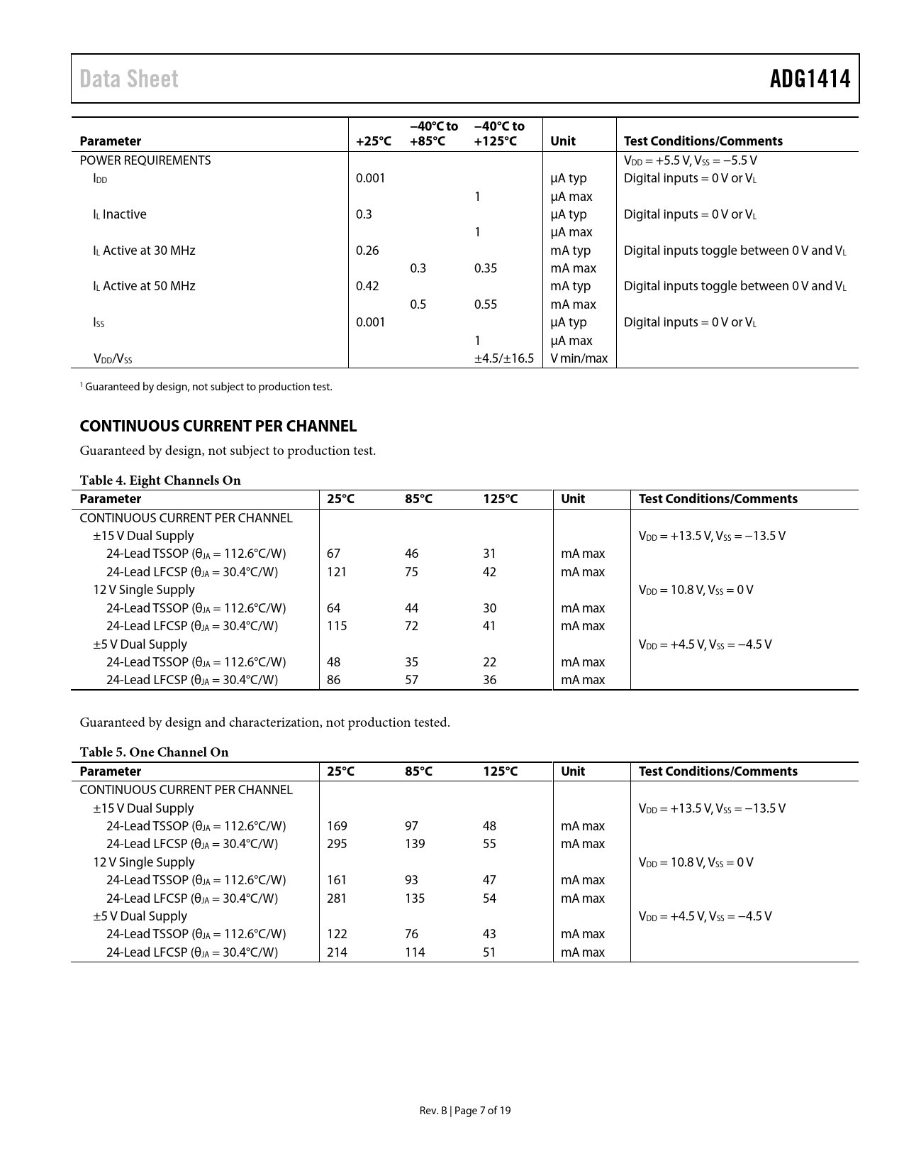 Data Sheet. ADG1414. −40°C to −40°C to. Parameter. +25°C. +85°C. +125°C. Unit. Test Conditions/Comments. CONTINUOUS CURRENT PER CHANNEL