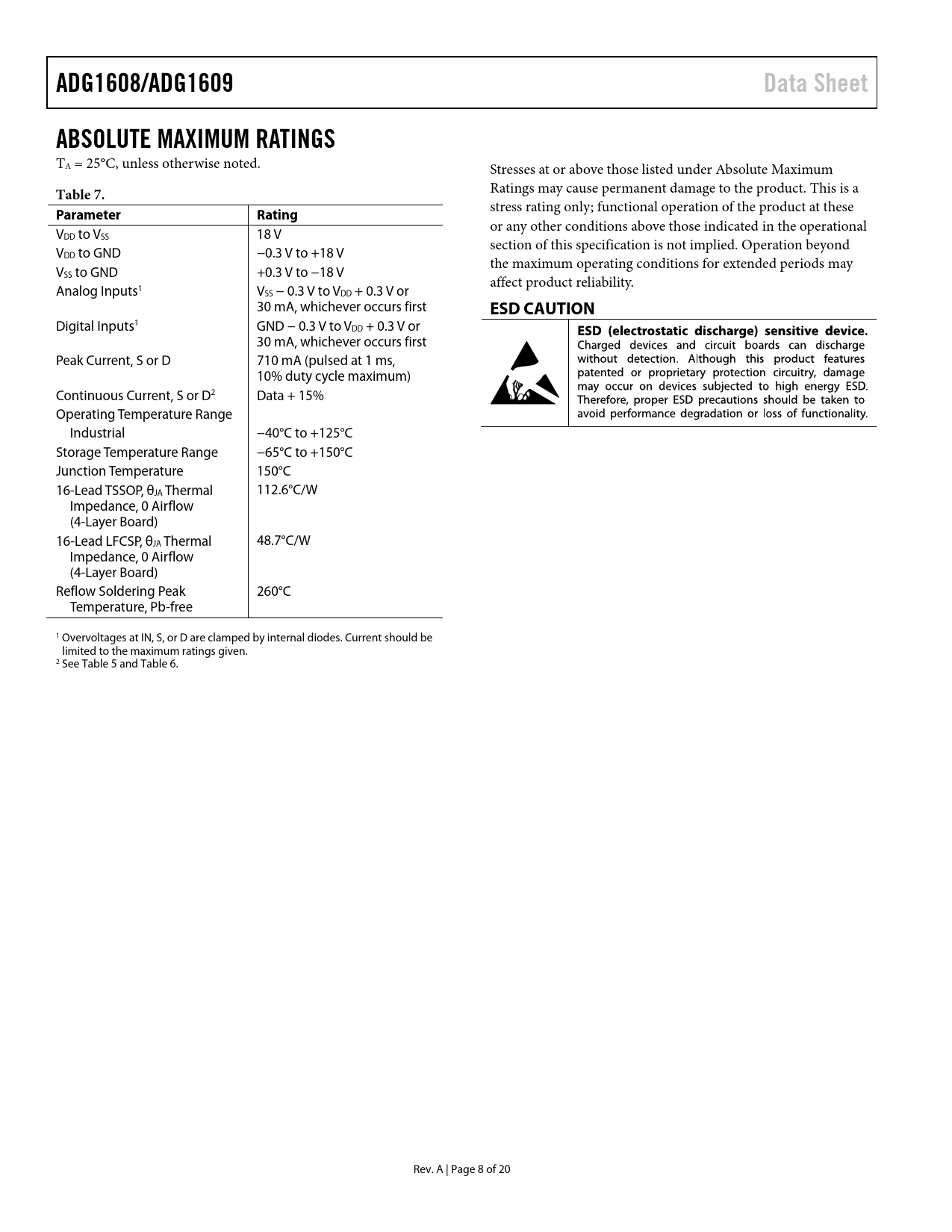 ADG1608/ADG1609. Data Sheet. ABSOLUTE MAXIMUM RATINGS. Table 7. Parameter Rating. ESD CAUTION