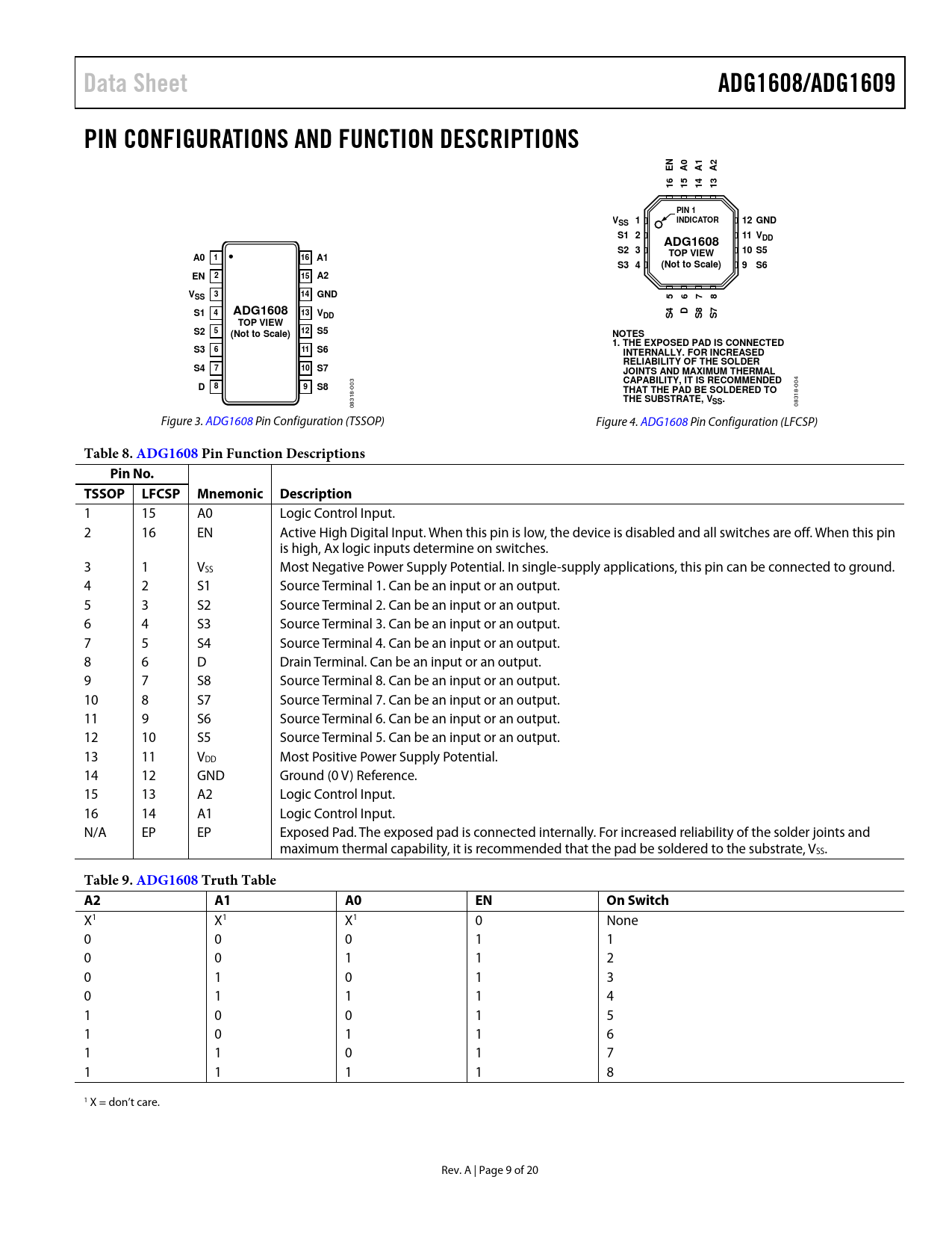 Pages / Page20 / 9 — Data Sheet. ADG1608/ADG1609. PIN CONFIGURATIONS AND FUNCTION …