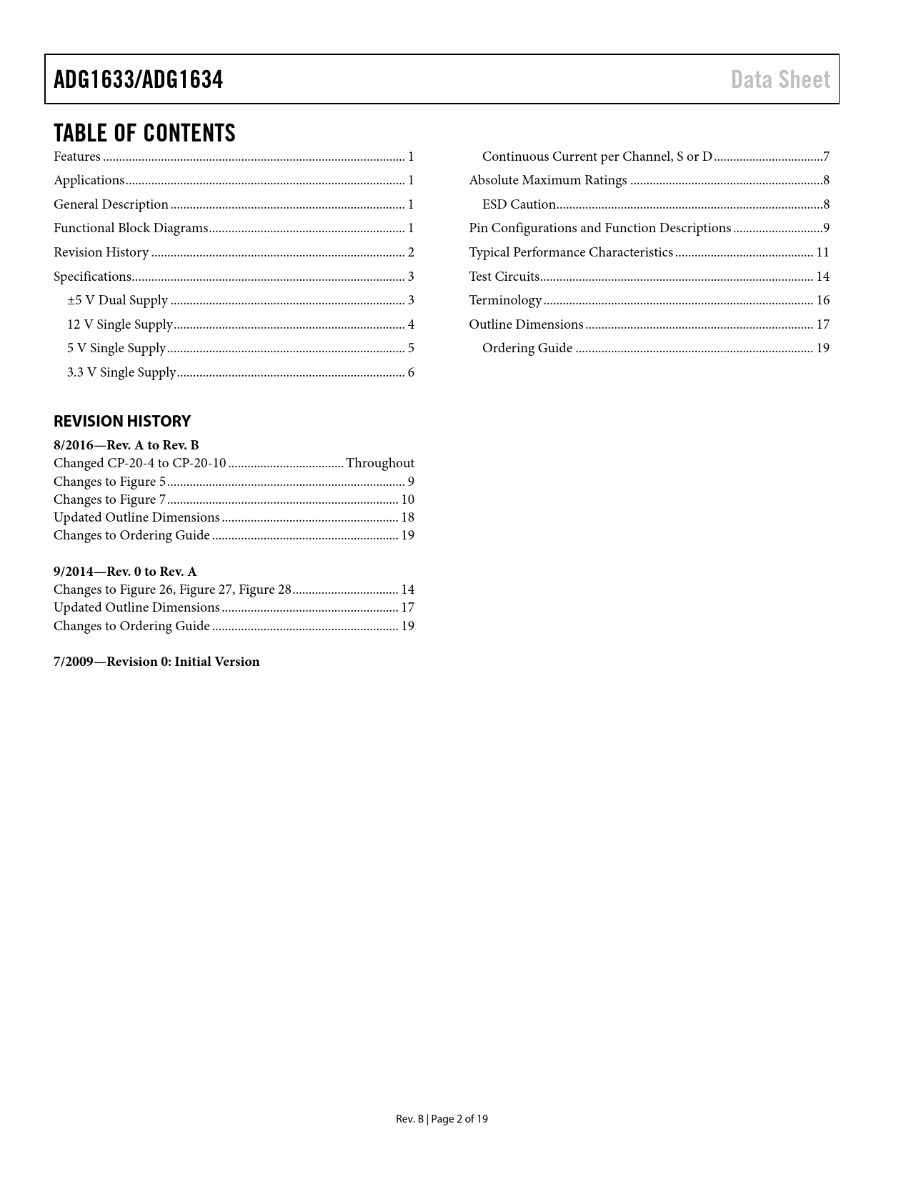 link to page 1 link to page 1 link to page 1 link to page 1 link to page 2 link to page 3 link to page 3 link to page 4 link to page 5 link to page 6 link to page 7 link to page 8 link to page 8 link to page 9 link to page 11 link to page 14 link to page 16 link to page 17 link to page 19 ADG1633/ADG1634Data SheetTABLE OF CONTENTS Features .. 1 Continuous Current per Channel, S or D ..7 Applications ... 1 Absolute Maximum Ratings ..8 General Description ... 1 ESD Caution...8 Functional Block Diagrams ... 1 Pin Configurations and Function Descriptions ..9 Revision History ... 2 Typical Performance Characteristics ... 11 Specifications ... 3 Test Circuits ... 14 ±5 V Dual Supply ... 3 Terminology .. 16 12 V Single Supply .. 4 Outline Dimensions ... 17 5 V Single Supply .. 5 Ordering Guide .. 19 3.3 V Single Supply ... 6 REVISION HISTORY 8/2016—Rev. A to Rev. B Changed CP-20-4 to CP-20-10 .. Throughout Changes to Figure 5 .. 9 Changes to Figure 7 .. 10 Updated Outline Dimensions ... 18 Changes to Ordering Guide .. 19 9/2014—Rev. 0 to Rev. A Changes to Figure 26, Figure 27, Figure 28 ... 14 Updated Outline Dimensions ... 17 Changes to Ordering Guide .. 19 7/2009—Revision 0: Initial Version Rev. B | Page 2 of 19 Document Outline FEATURES APPLICATIONS GENERAL DESCRIPTION FUNCTIONAL BLOCK DIAGRAMS TABLE OF CONTENTS REVISION HISTORY SPECIFICATIONS ±5 V DUAL SUPPLY 12 V SINGLE SUPPLY 5 V SINGLE SUPPLY 3.3 V SINGLE SUPPLY CONTINUOUS CURRENT PER CHANNEL, S OR D ABSOLUTE MAXIMUM RATINGS ESD CAUTION PIN CONFIGURATIONS AND FUNCTION DESCRIPTIONS TYPICAL PERFORMANCE CHARACTERISTICS TEST CIRCUITS TERMINOLOGY OUTLINE DIMENSIONS ORDERING GUIDE